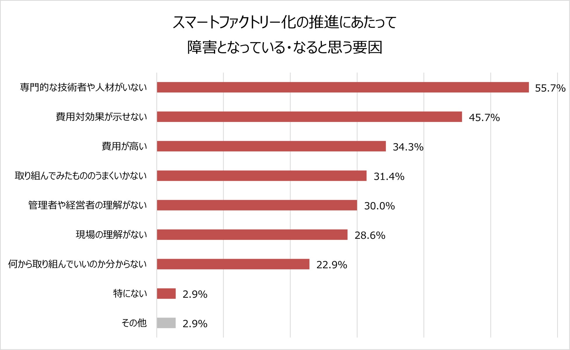 また、「専門的な技術者や人材がいない」、「費用対効果が示せない」という要因でスマートファクトリー化が滞っていると感じている方も多いことが分かりました。