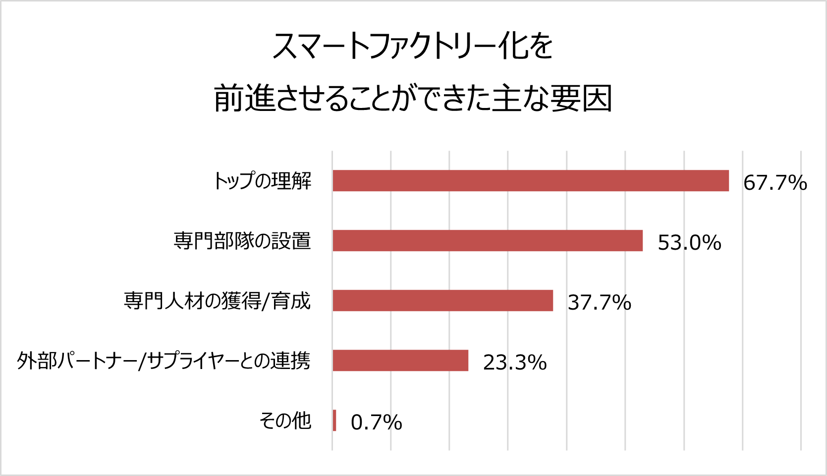 ・成功の要因は、「スマートファクトリー化に対するトップの理解(トップダウンの方針含む)」が67.7%で最も多く、「専門部隊の設置」が53.0%と続いた。