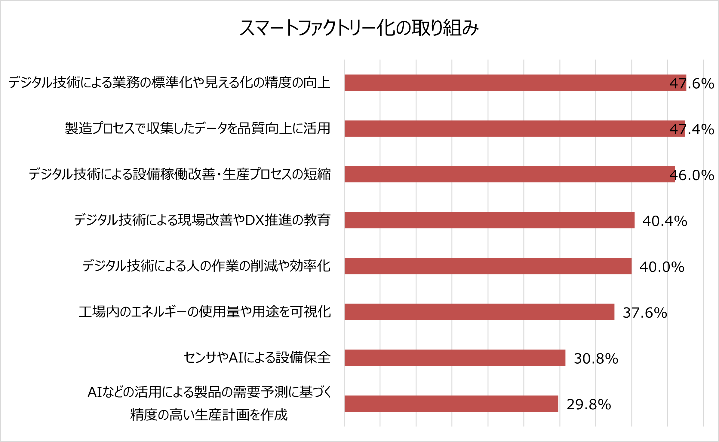 どのような取り組みを行っているかをお聞きすると、「デジタル技術(IT/OT)の活用により業務の標準化やノウハウの見える化の精度を向上させ、技術継承に役立てている」と回答した方が最も多く47.6%となりました。僅差で「製造プロセスで収集したデータを品質向上に活用している」47.4%と続き、「デジタル技術(IT/OT)を活用して設備稼働率改善や生産プロセス短縮を行っている」と回答した方も46.0%となりました。