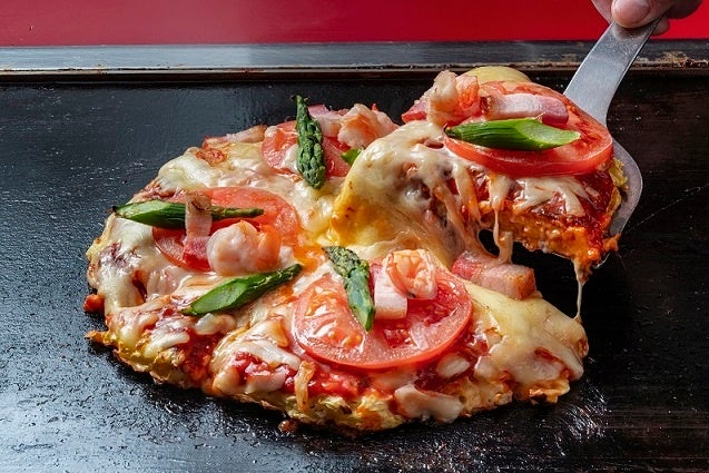 ファミリー、お友達同士でワイワイ切り分けながら、ヘラで食べる「お好み焼きピザ」は鉄板にたれたチーズがパリパリに焼け、スナックのように食べることも楽しみの一つです。
