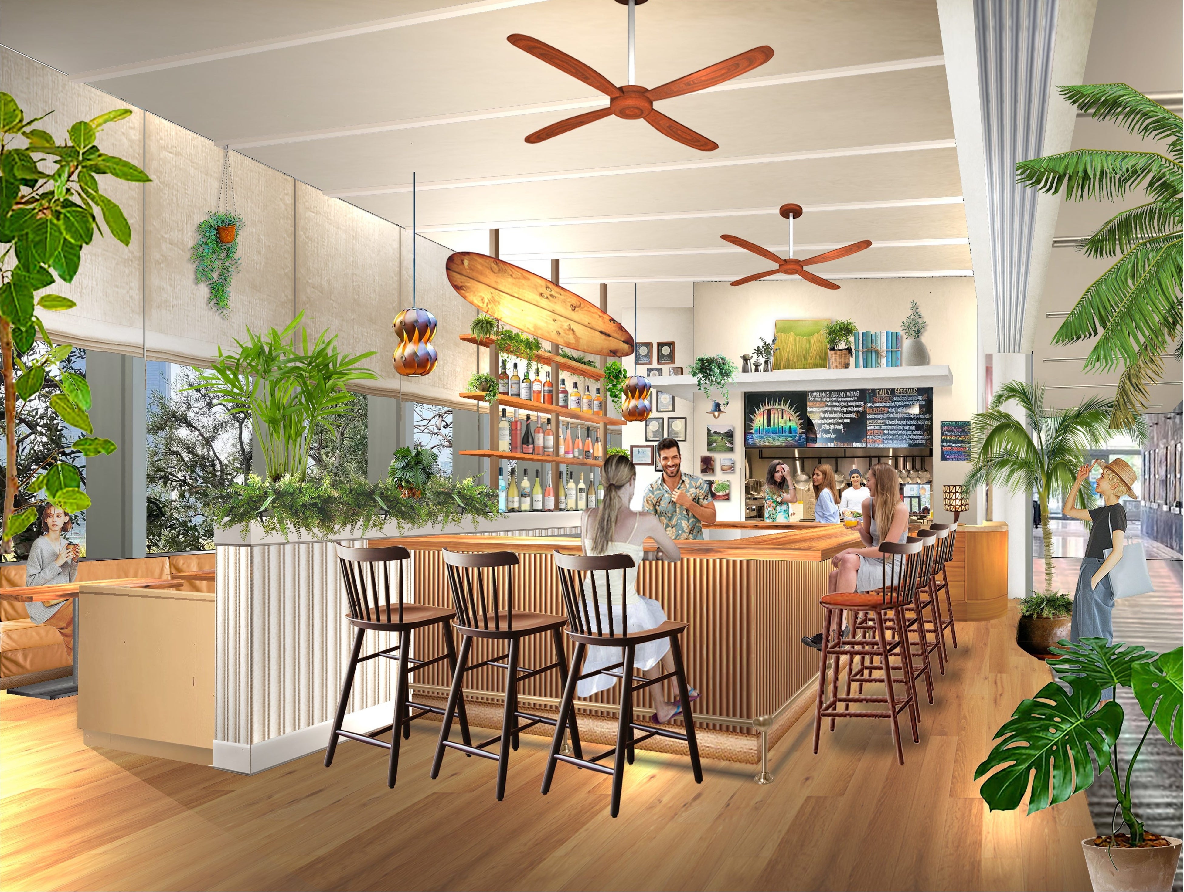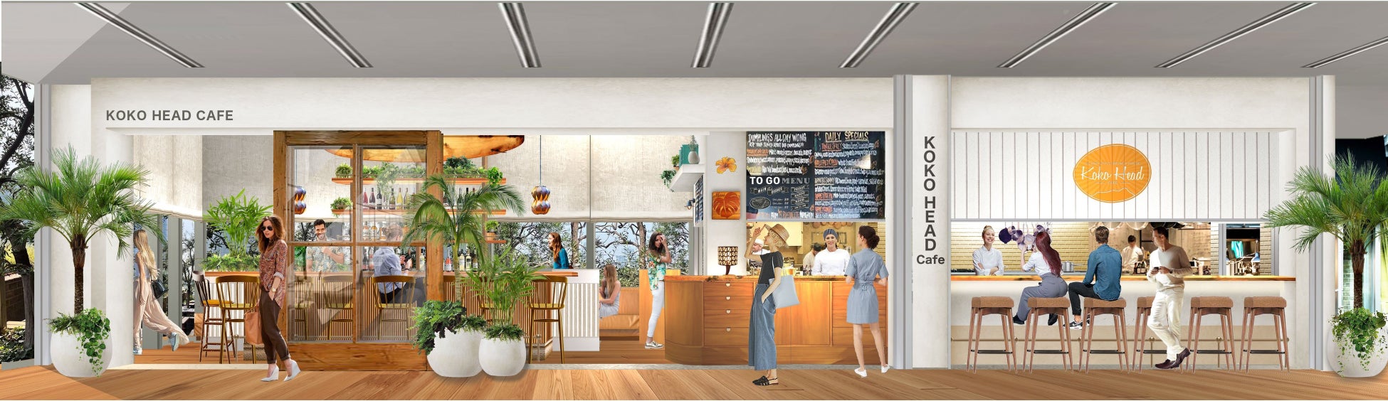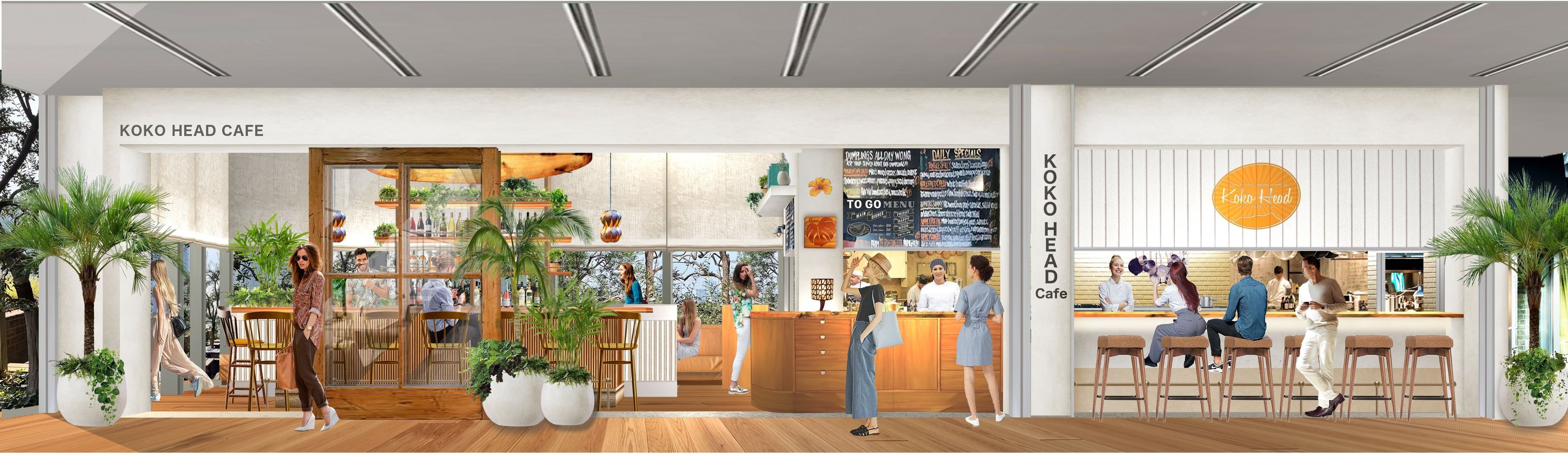 今回オープンするKoko Head cafeでは、現地の看板メニューをはじめ多数のメニューがラインナップ。ベーコンとアイスクリームをのせ、甘じょっぱさがクセになる「コーンフレークフレンチトースト」 、ハワイアンフード「ロコモコ」をアレンジした「ココモコ」 、ラスクにマカデミアナッツ入りのヨーグルトとフルーツをのせた「ブレックファーストブルスケッタ」など、東京にいながらハワイの味をご堪能いただけます。サーフボードや植物を飾った開放感のある空間でゆったりと食事を楽しんでいただくイートインのほか、テイクアウトでもご利用いただけます。