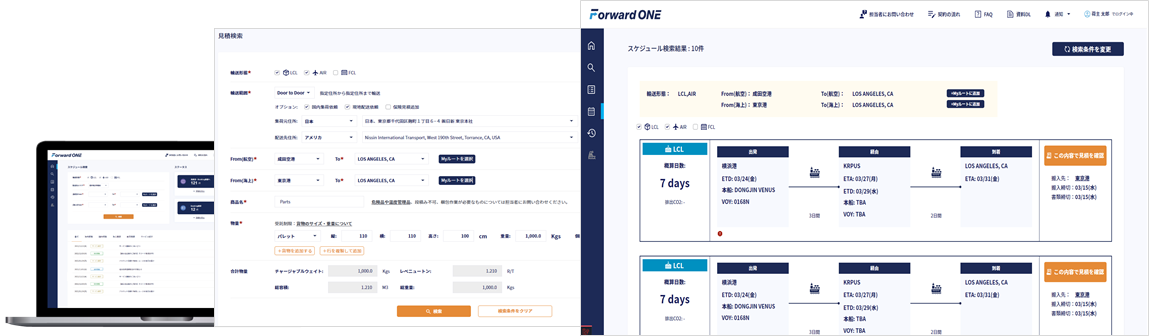 今回の「Forward ONE」リニューアル版では見積・スケジュール検索などの操作画面を全面的に刷新し、お客様の使い勝手を改善しております。