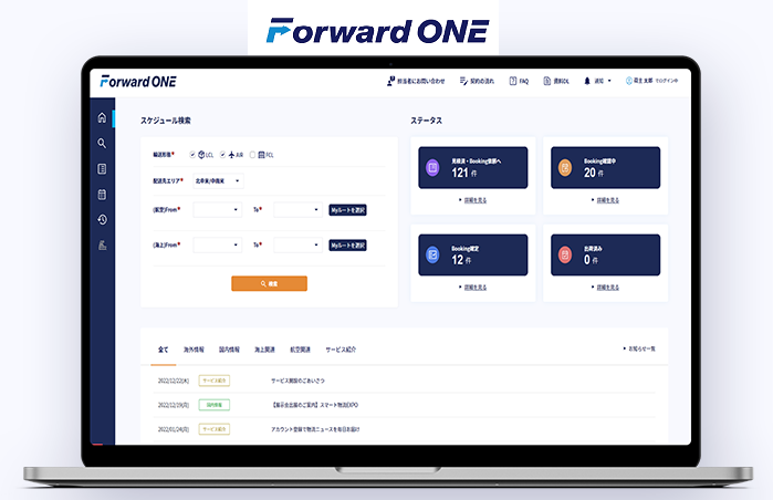 「Forward ONE」はお客様とフォワーダーの間で行われる「国際輸送費の算出、本船スケジュール・輸送スペースの確認、Booking依頼、書類のやり取り、船積み作業の進捗管理、本船のトラッキング」などをオンラインサイト上で一貫して行うことで、各関係者の業務効率化・負担低減を図るサービスです。