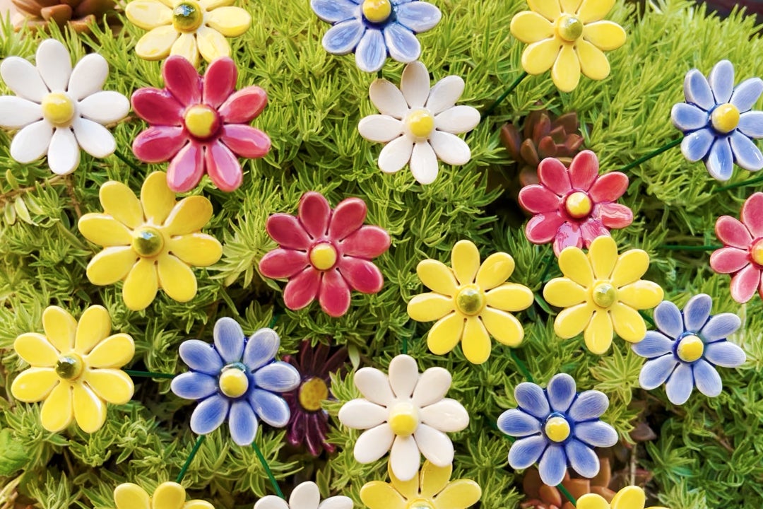 屋外でもガーデニングのアクセントに最適な陶器の花。紫外線に強い釉薬を使用しているため、色あせることなく長期間美しさを保ち続けます。ガーデンやテラスなどの屋外空間に、彩り豊かなアクセントを添えることができます。