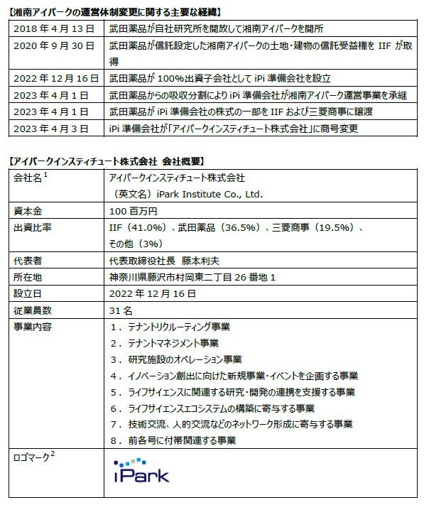 2023年4月1日、iPi設立準備株式会社(本社:神奈川県藤沢市、以下「iPi準備会社」)は、武田薬品工業株式会社(本社:大阪市中央区、以下「武田薬品」)がこれまで産業ファンド投資法人(本社:東京都千代田区、以下「IIF」)より受託してきた湘南ヘルスイノベーションパーク(以下、「湘南アイパーク」)の運営事業を、武田薬品からの吸収分割によって承継しました。また、同日、武田薬品が保有していたiPi準備会社の株式の一部がIIF、三菱商事株式会社(本店:東京都千代田区、以下「三菱商事」)に譲渡され、iPi準備会社はこの3社を主要株主とする会社となりました。なお、上記事業承継に伴い、本日iPi準備会社は商号を「アイパークインスティチュート株式会社」に変更しました。