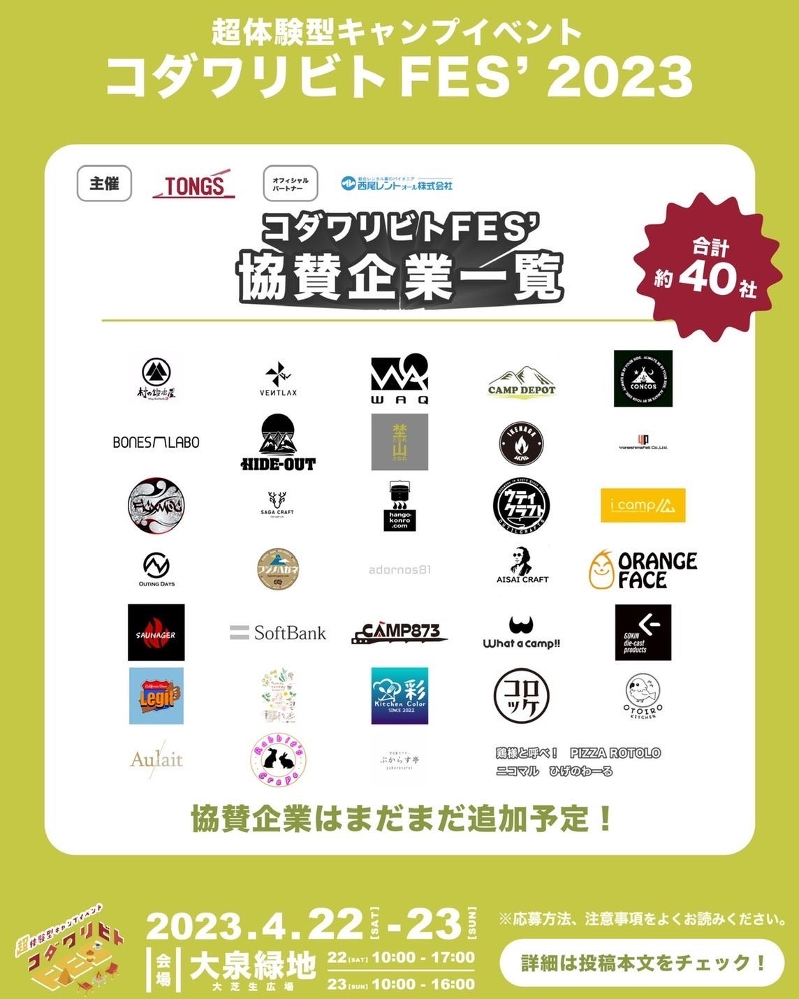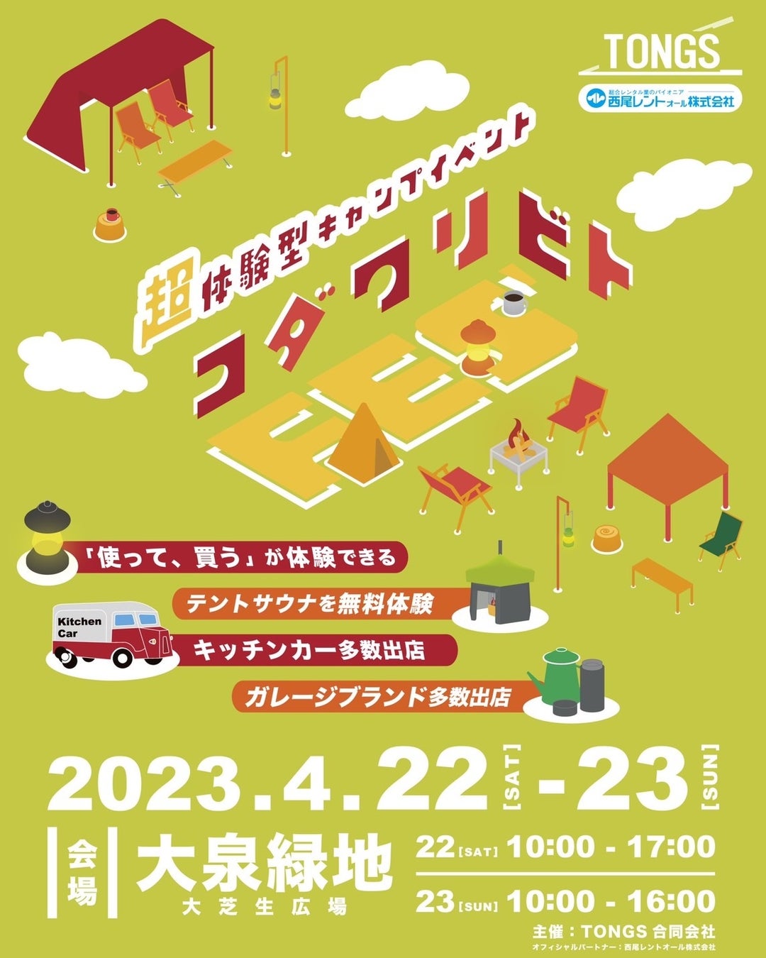 【史上初】全出展アウトドアブランドのギアを体験できるアウトドアイベント「コダワリビトFES'」が2023年4月22日~23日、大阪府堺市で開催。無料テントサウナ体験や40組限定でキャンプスペースも