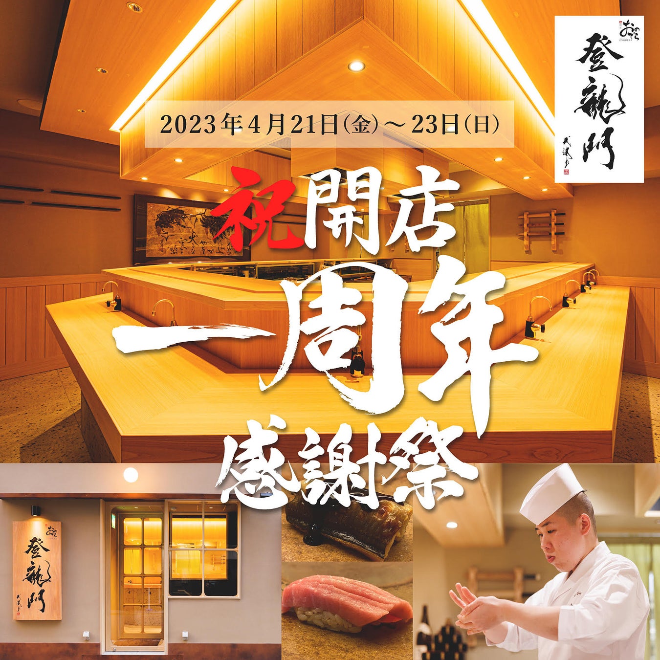 株式会社 ONODERA フードサービス(代表取締役社長:長尾 真司 所在地:東京都千代田区)が運営する「鮨 銀座おのでら 登龍門」は、2023 年4月 21 日(金)から4月 23 日(日)まで「祝・開店 1周年感謝祭」を開催いたします。