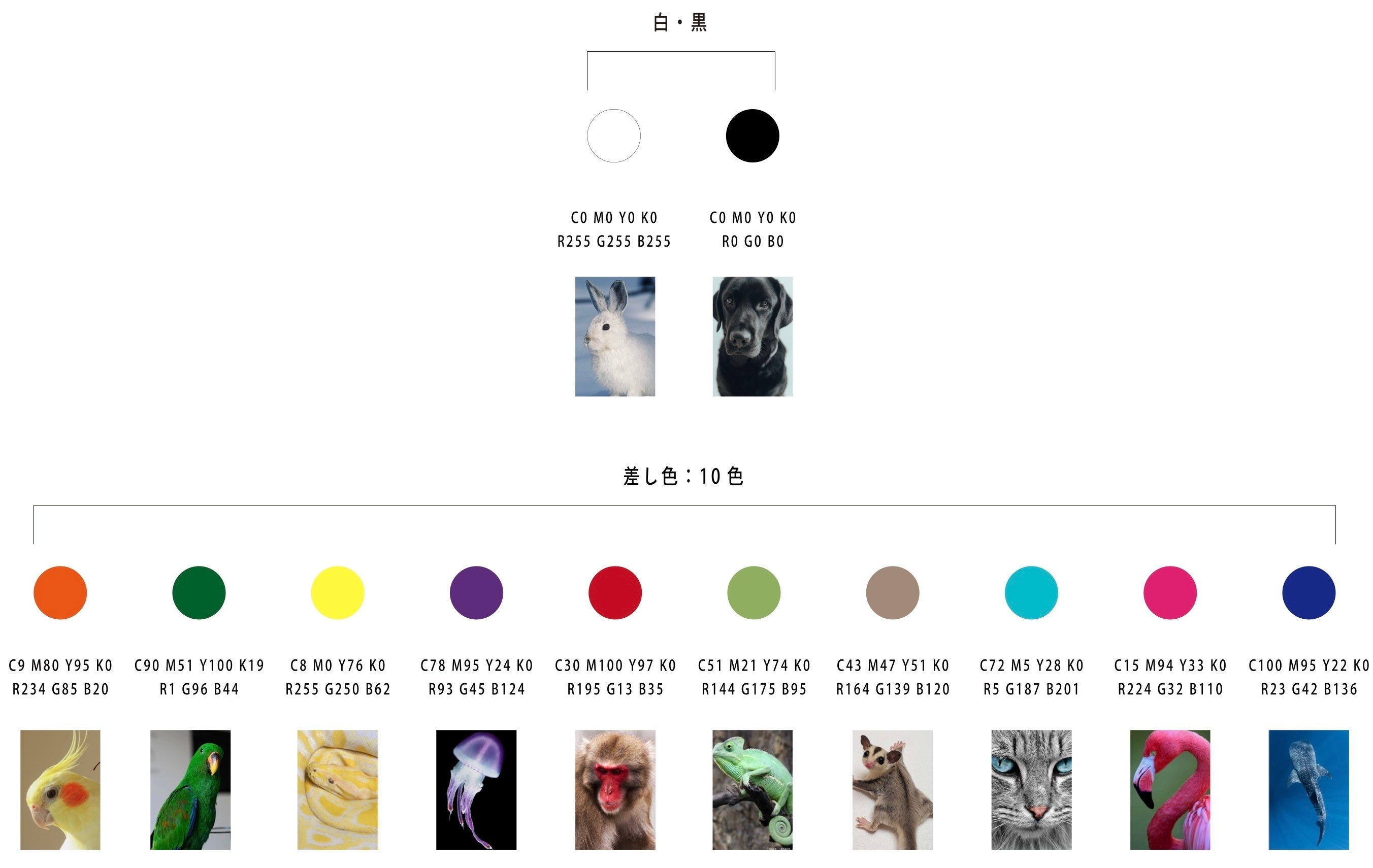 シンプルな白黒をベースに、自然界に溢れる様々な色の中でも、memoが大切にしている動物からインスピレーションを受けた差し色10色を加えた、12色で構成されています。