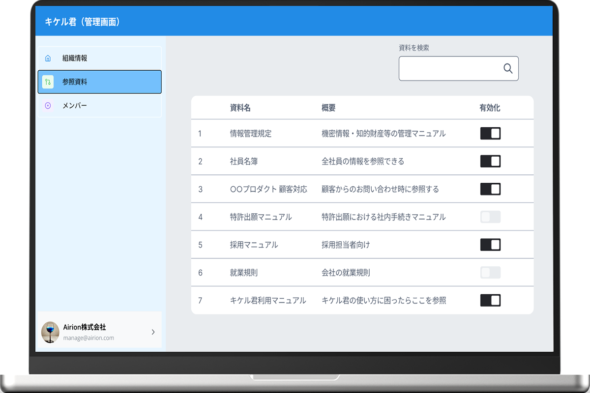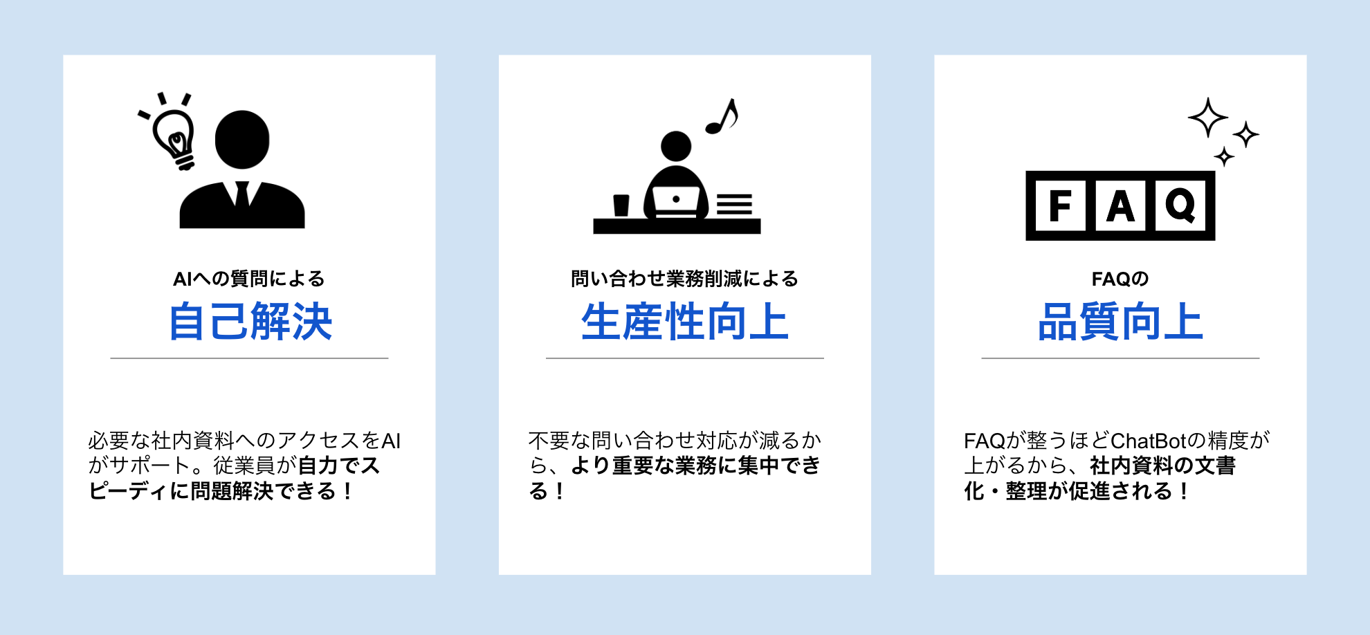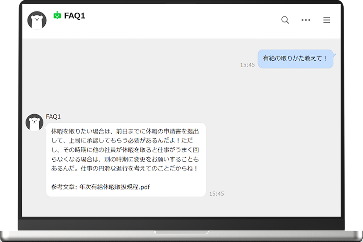 キケルくんは、社内の規定や資料を参照し、よくある社内からの問い合わせに対し、高精度で自動回答してくれるAI ChatBotサービスです。