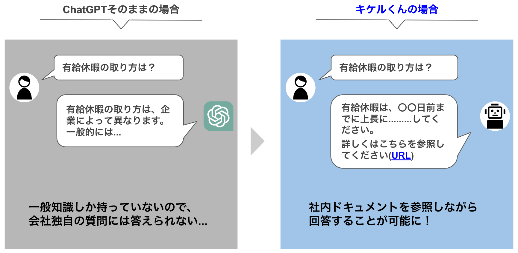 一方、キケルくんは社内FAQなどの独自情報を参照させて回答することが可能なため、より便利なAI ChatBotとしてご利用いただけます。