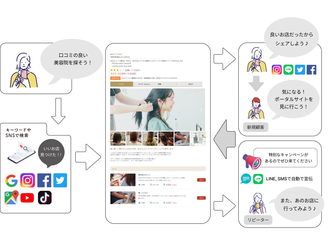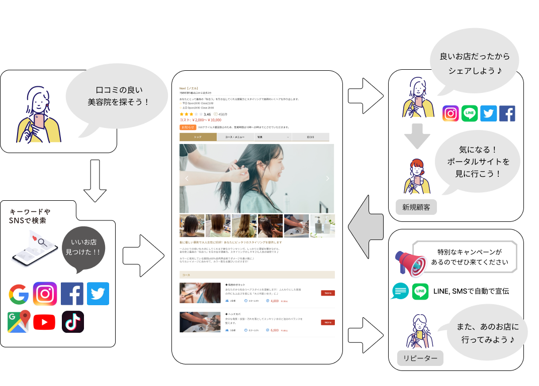 SNSとリンクした予約機能でSNSからの流入で集客を見込むことが可能となります。また、開封率の高い LINEやSMSの自動送信で特定ユーザーへ販促や告知が行えるので、リピーターの獲得を効率化することができます。