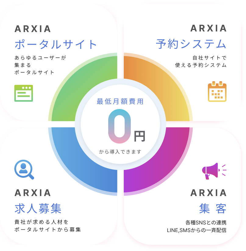 集客×予約×求人とひとつにした、オールインワンの予約システム「アークシア総合予約」になります。