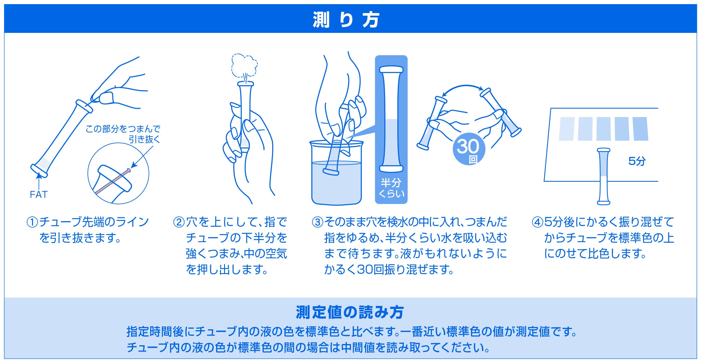 吸い込んでチューブを振るだけで測定が可能です。(公定法だと煩雑な操作が必要)