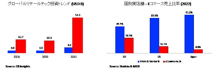 NuRetailは、ファウンダーでCEOの飯田健作の「真のオムニチャネルの推進には、実店舗のDXが不可欠」との思いから設立されました。世界最古の産業の一つである小売業界では過去三十年間、Eコマース領域を中心とした数多くの革新がありました。その結果、Eコマースは順調に伸び続けており、実店舗へのリテールテック投資はグローバルで約1兆円であるのに対し、Eコマースへは約7兆円と7倍もの投資が流れ込んでいます(出所:CB Insights 2021. 1ドル=130円換算)。