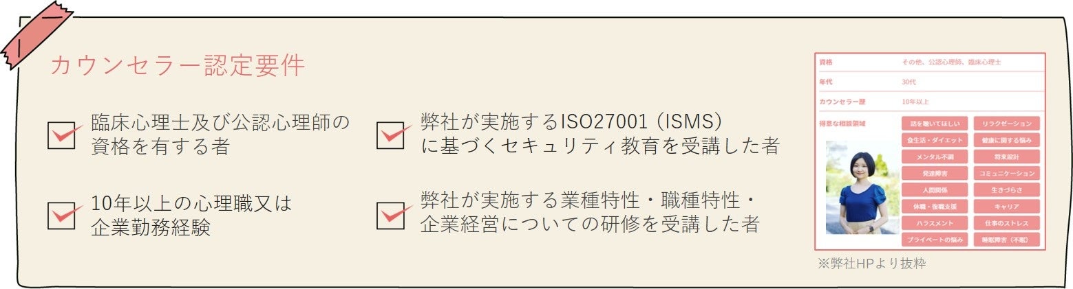 さらに、「Plattalks」には、社会保険労務士と心理士が共同で運営に当たることで、メンタルヘルスに多角的に働きかけられるというメリットがあります。厳格な基準をもとに選抜した心理士による、質の高いカウンセリングサービスの提供に加え、社会保険労務士が、企業や組織の制度設計に携わった経験を活かして、個人の具体的な情報は伏せた上で相談内容から企業の潜在的な課題を抽出し、適切な解決策を提案する組織改善コンサルティングのサービスも併せて提供しています。