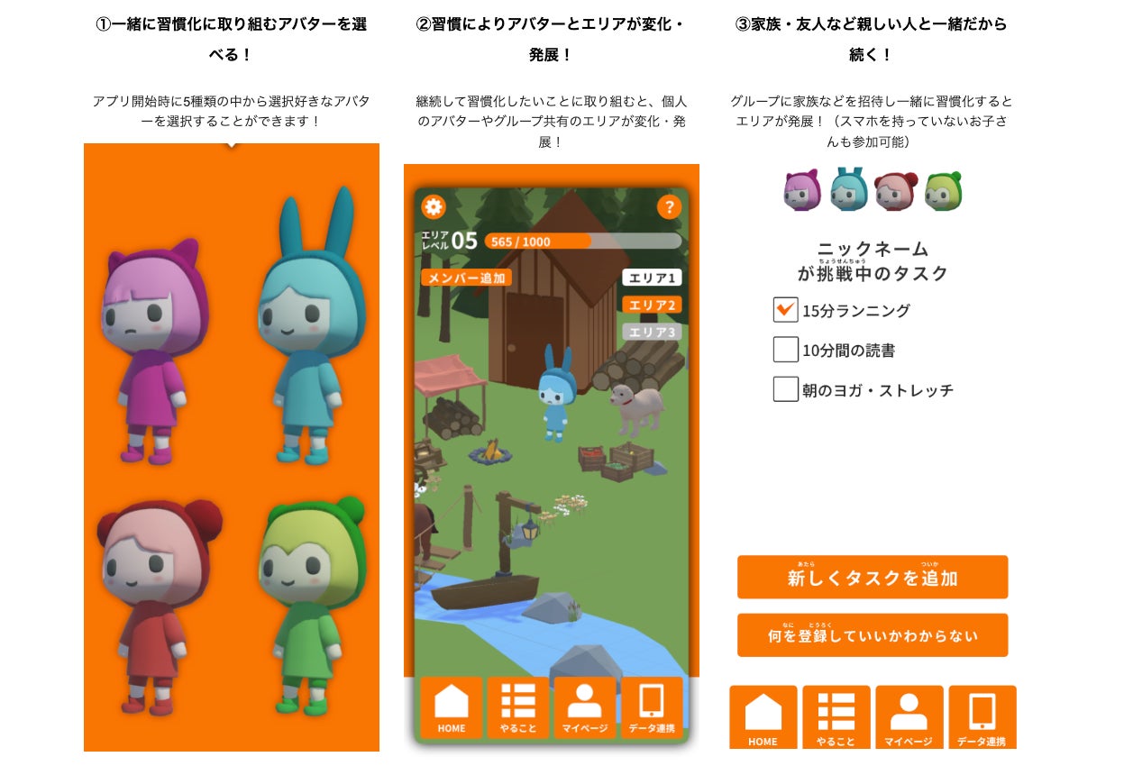 3Dのアバターや冒険をイメージしたエリアが習慣化により変化・発展していく、グループIDにより家族や友人とデータ連携が可能、グループメンバーの登録している習慣化したいことやその進捗を確認できる、などグループで楽しく習慣化に取り組むための機能を多く搭載しています。