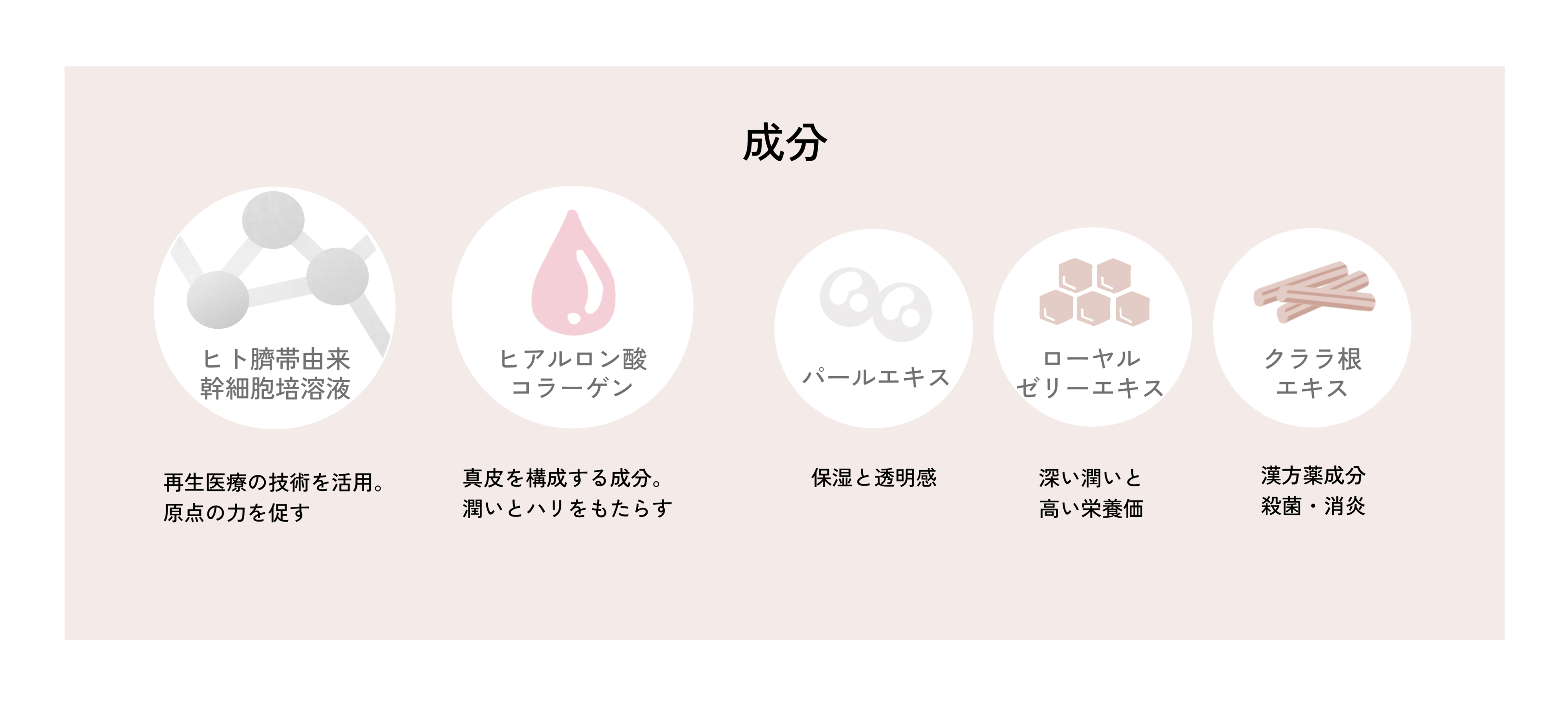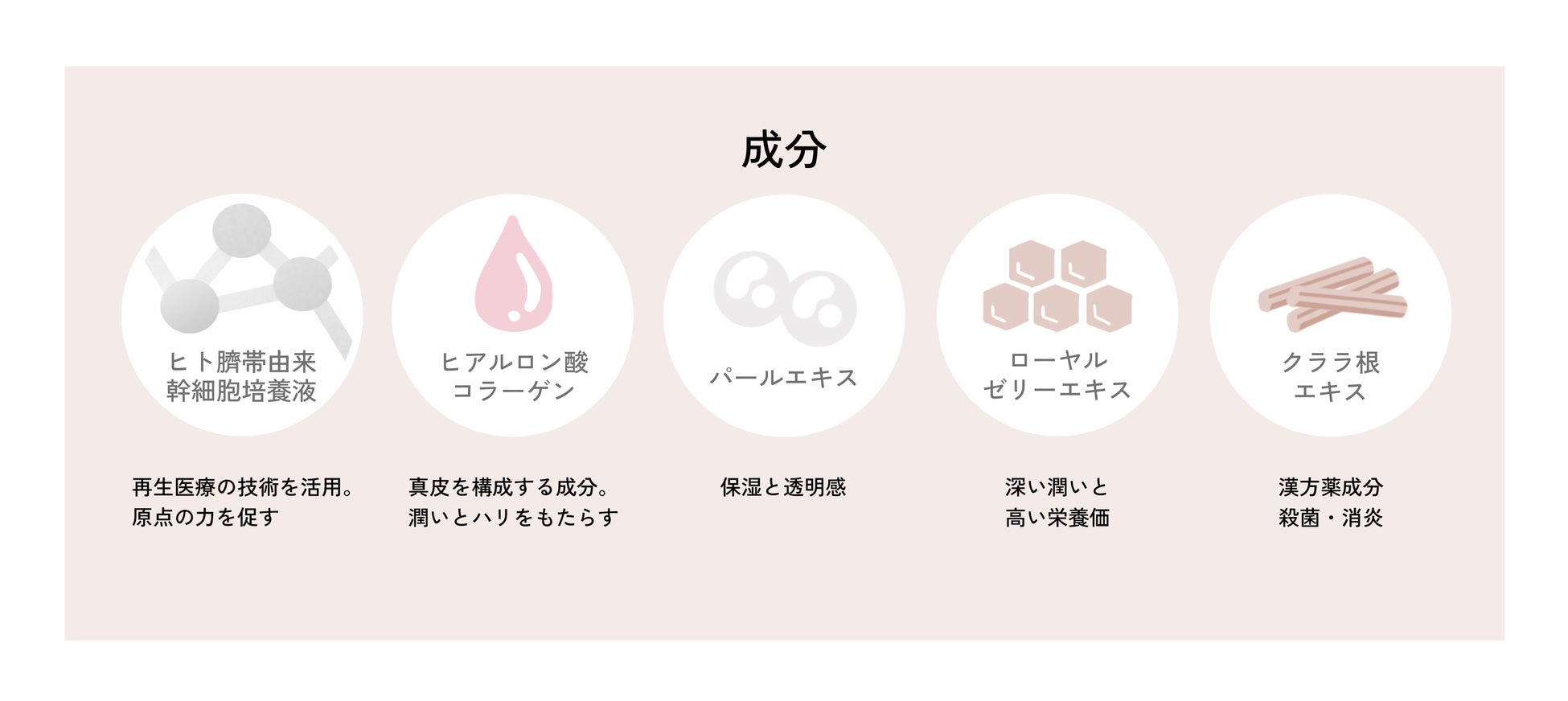 要となる「ヒト幹細胞培養液」は、日本人ドナーから採取した組織を使い、体内での拒絶反応や異物反応が起きにくいといわれる、ヒト幹細胞を培養する過程で生じる上澄み液(培養上清)だけを抽出したものを採用(微生物検査実施)。
