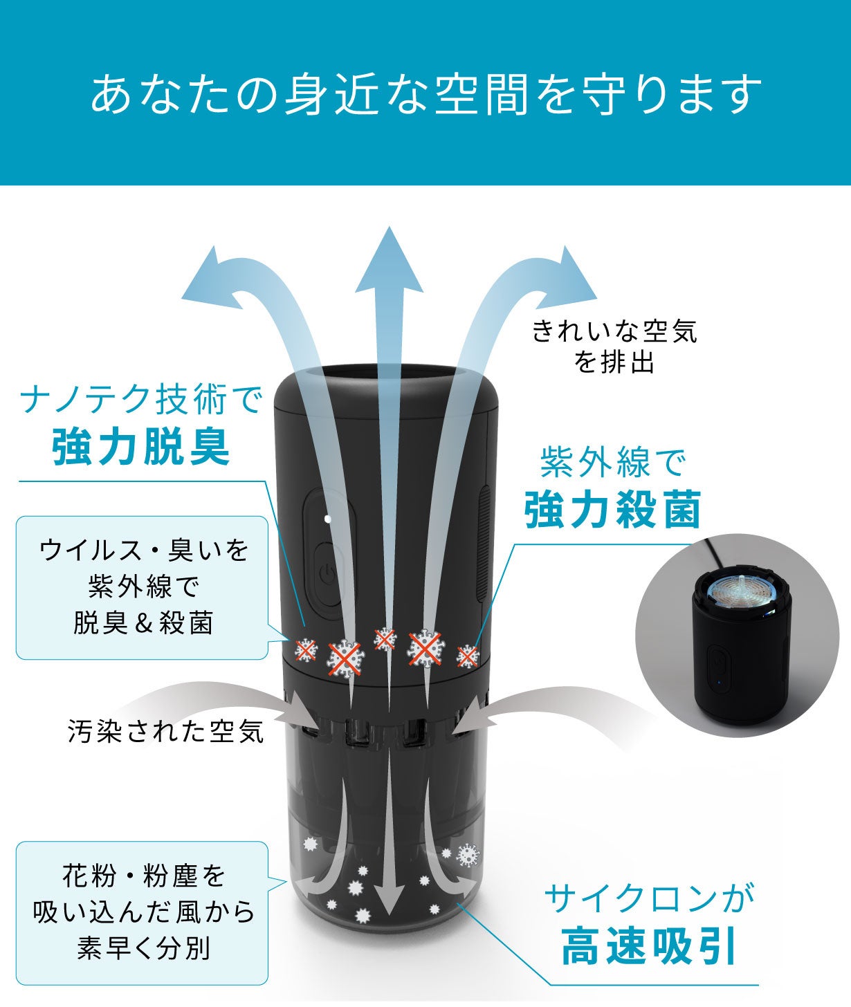 【ナノテク技術でウイルスを閉じ込めて徹底除去&脱臭 フィルターレス超小型空気清浄機】