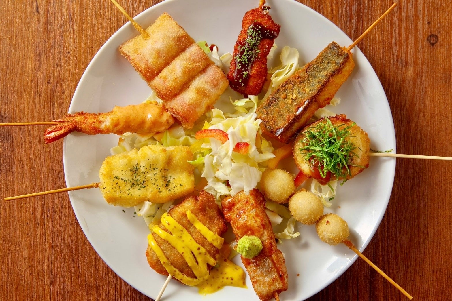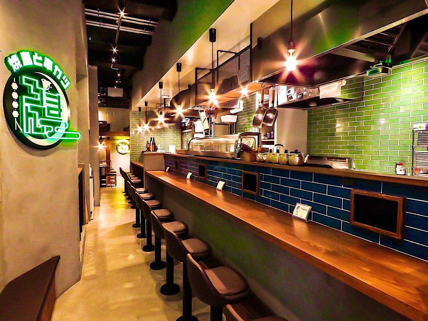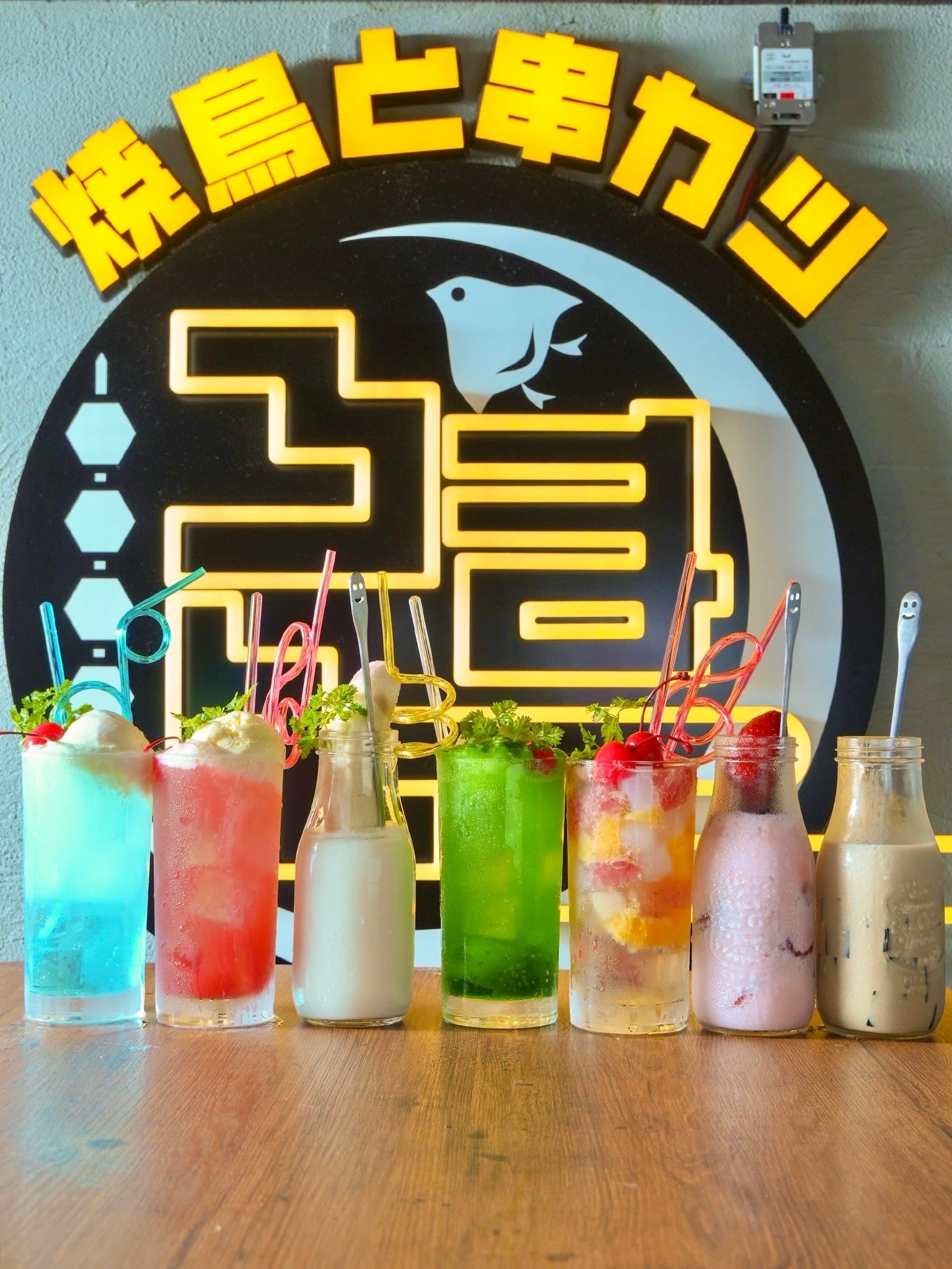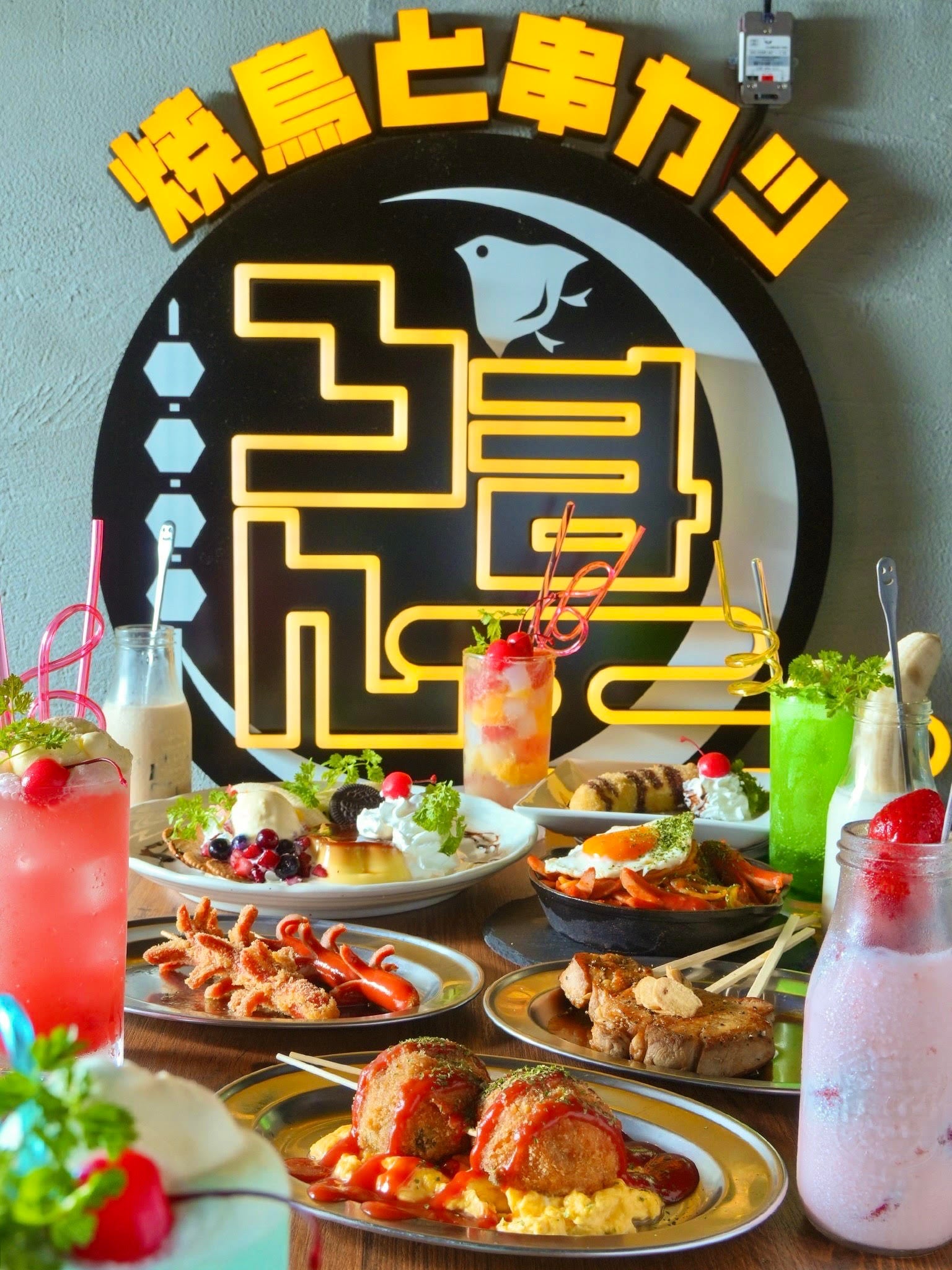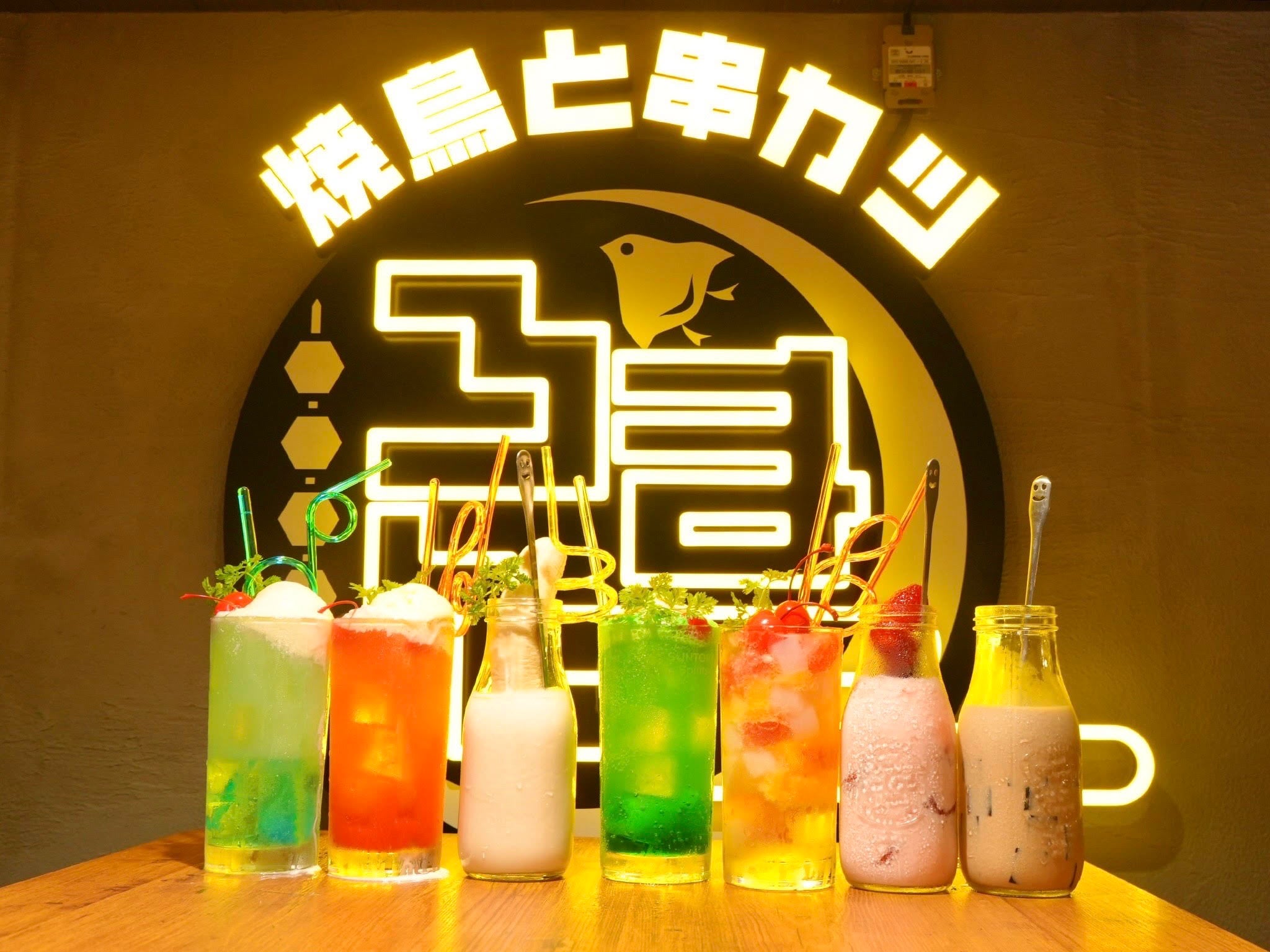 創作酒場「焼鳥 × 串カツ」をコンセプトに、定番メニューだけでなく創作メニューまで、焼鳥全28種類、串カツ全26種類をご用意!カラフルで豊富なドリンクをはじめ、飲み放題メニューも大人気。ネオンのサインが印象的な空間は、カウンター席、テーブル席、ロフト席とシーンに合わせた使い分けが可能です。