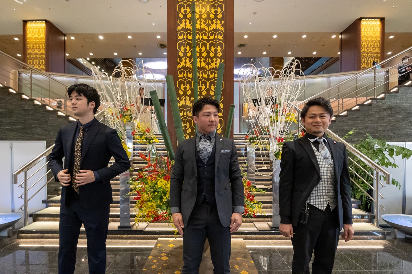 メインイベントとなるIKENOBOYS(いけのぼーいず) 生け花パフォーマンスは、田中伸明(たなかのぶあき)、小杉秀樹(こすぎひでき)、馬場健(ばばたける)の3名が登場。「栄光」をテーマに、華やかさだけでなく風格の漂うインスタレーション作品が、約20分間のパフォーマンスとともに創りあげられました。