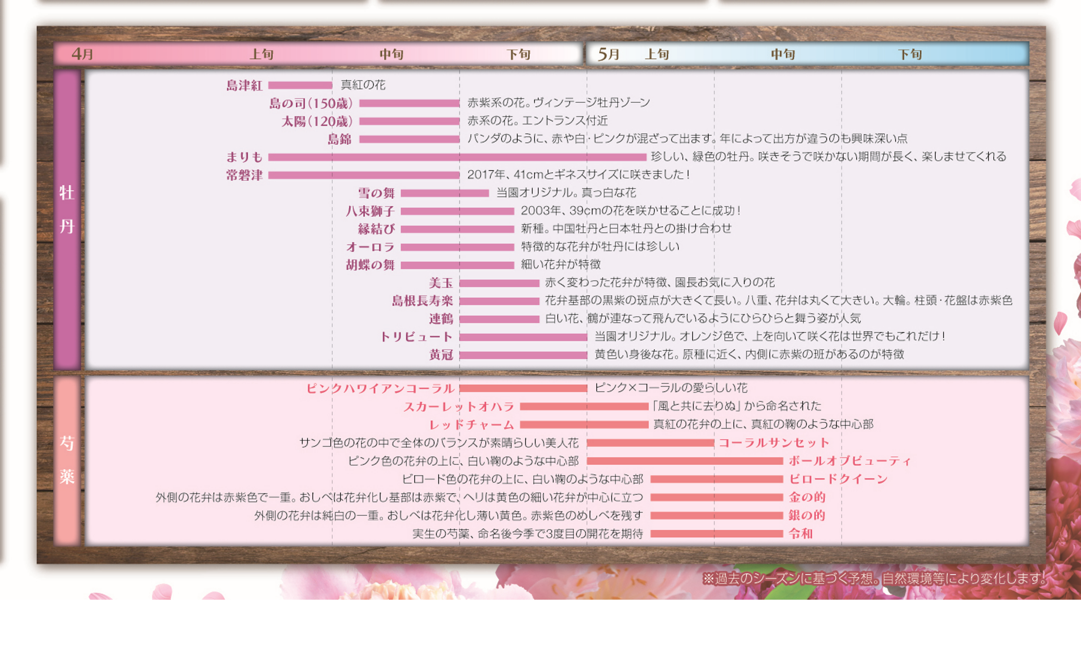 当園は、良質な“土壌”を作ることにこだわり、有機物を酵素の力により短期間で発酵させる「農薬不使用・酵素農法」を20年以上実践してまいりました。そのため毎年、丈夫で魅力的な花を数多く咲かせることができます。牡丹の花一輪は3〜4日ほどで散っていくため、期間中は多様性に富んだ花々が、主役を交代しながら園内を彩ります。牡丹とシャクヤクの移り変わる花景色を鑑賞いただけるのは、一年のうち、たった44日間だけの貴重な期間です。