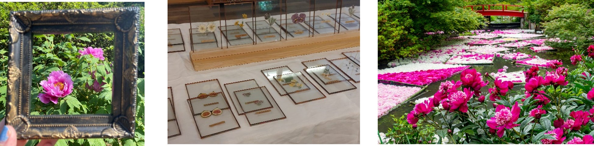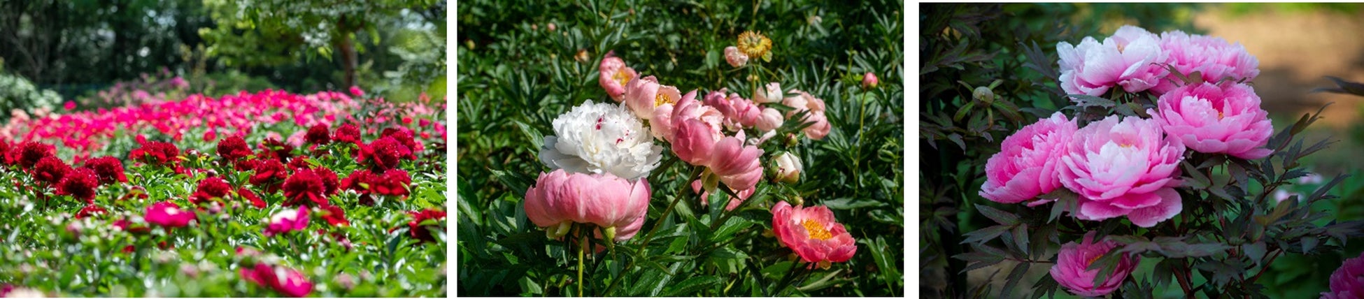 左/フォトコンテスト作品、中/Peony Gardenギャラリー、右/約5千株のシャクヤクの花筏