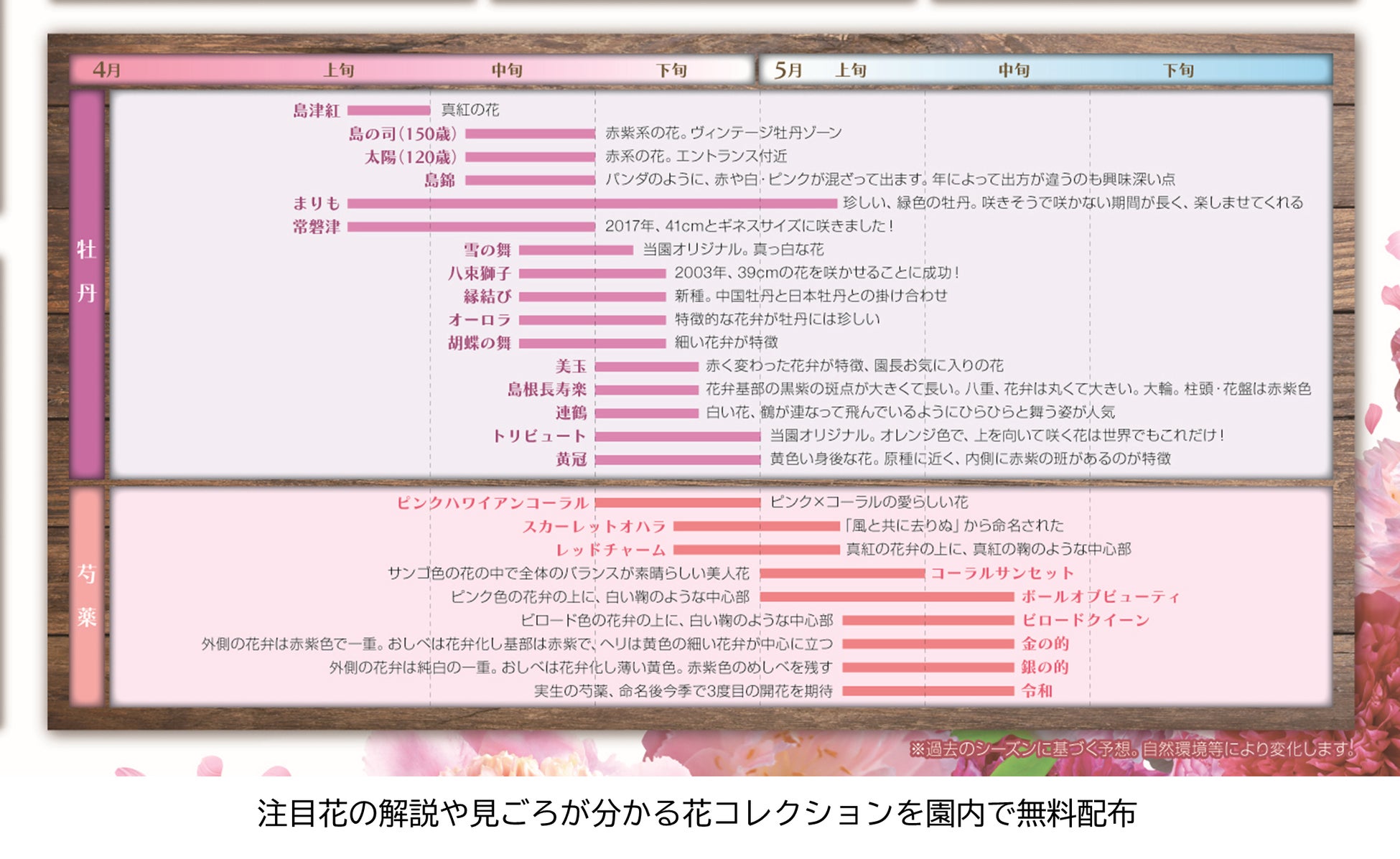 今季、世界三大美人といわれる楊貴妃・小野小町(花の名前は「小町白」)・クレオパトラにちなんだ牡丹のコーナーを新設しました。見頃は楊貴妃が4月中下旬、小町白・クレオパトラが4月下旬頃です。