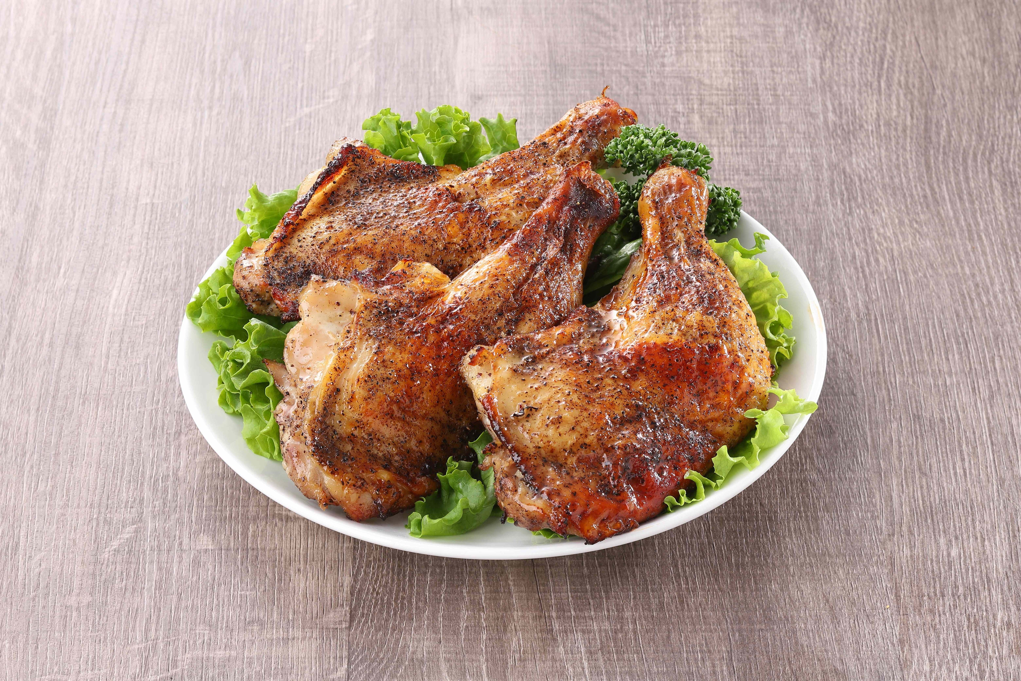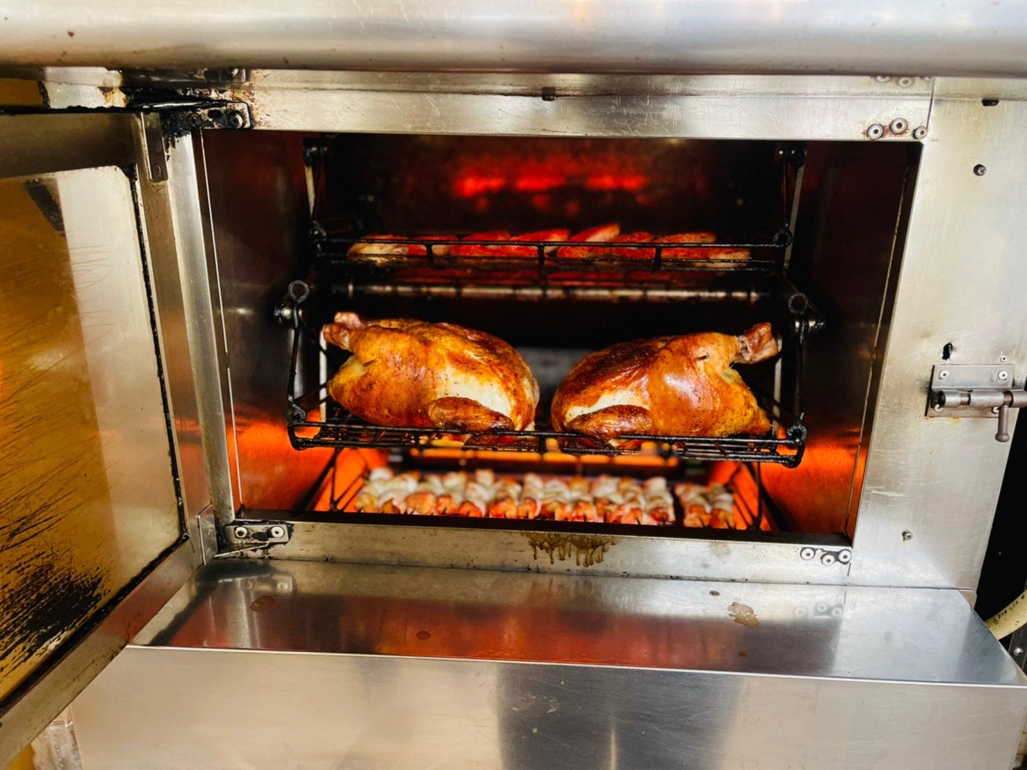 ロティサリーオーブン(回転ロースター)で焼かれた鶏は余分な脂を落としながら、また下で脂を受けることで脂の旨味が凝縮され、シンプルな味付けながら味わい深く焼き上がります。