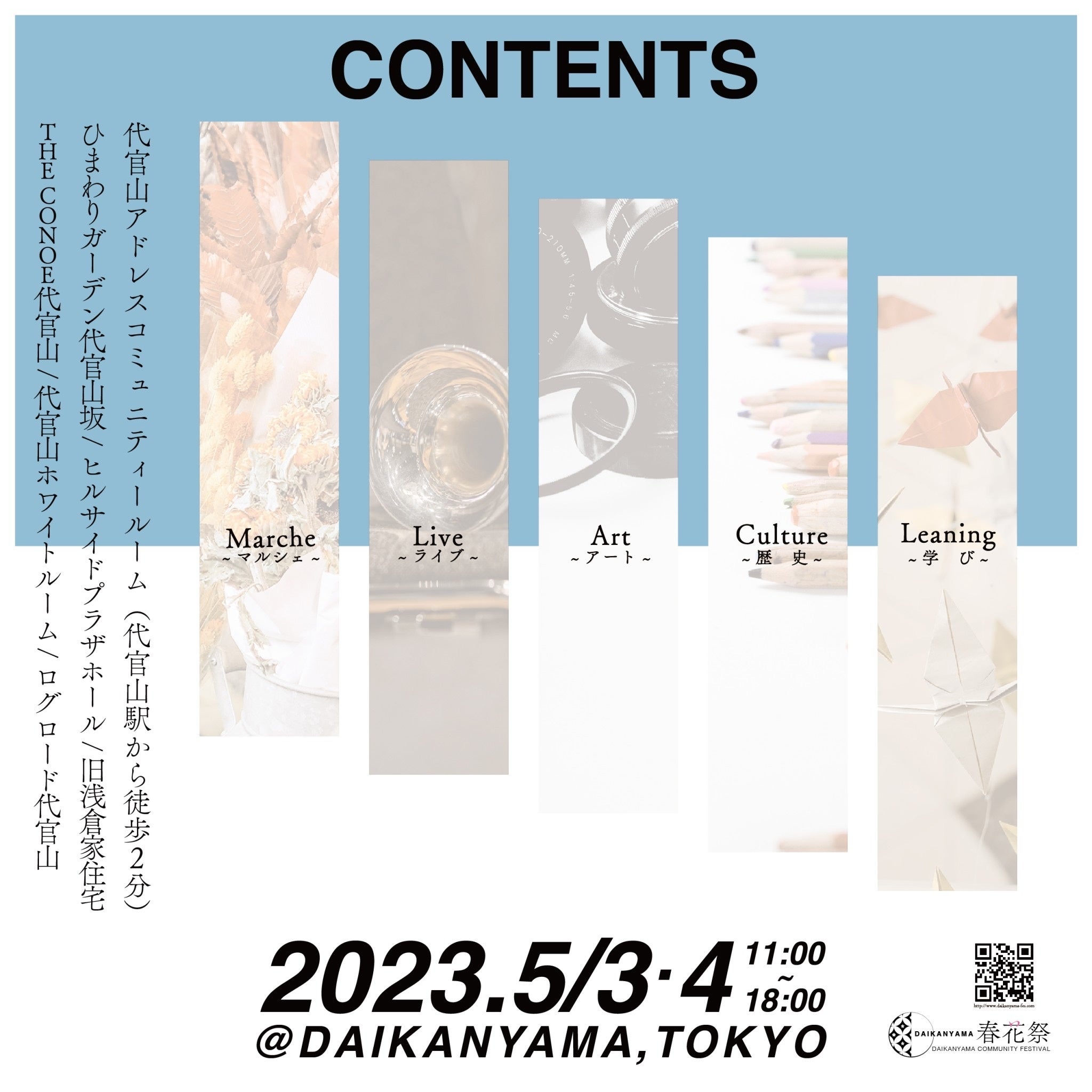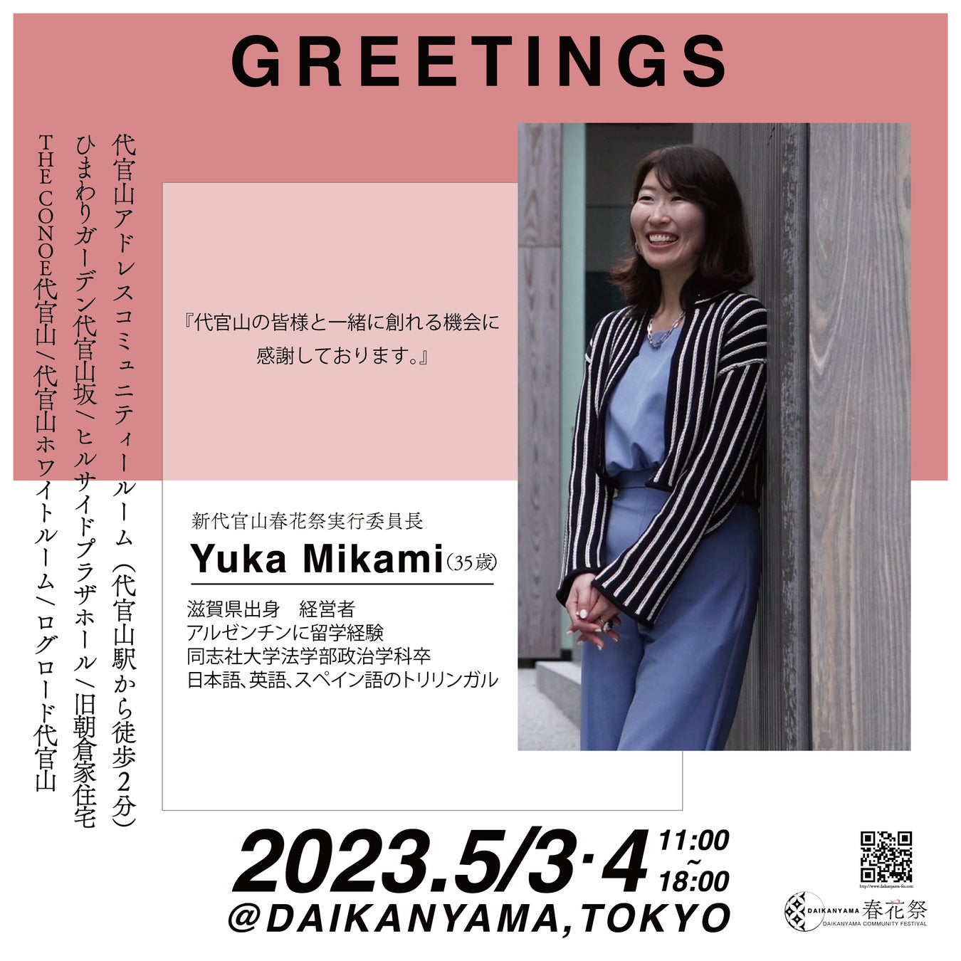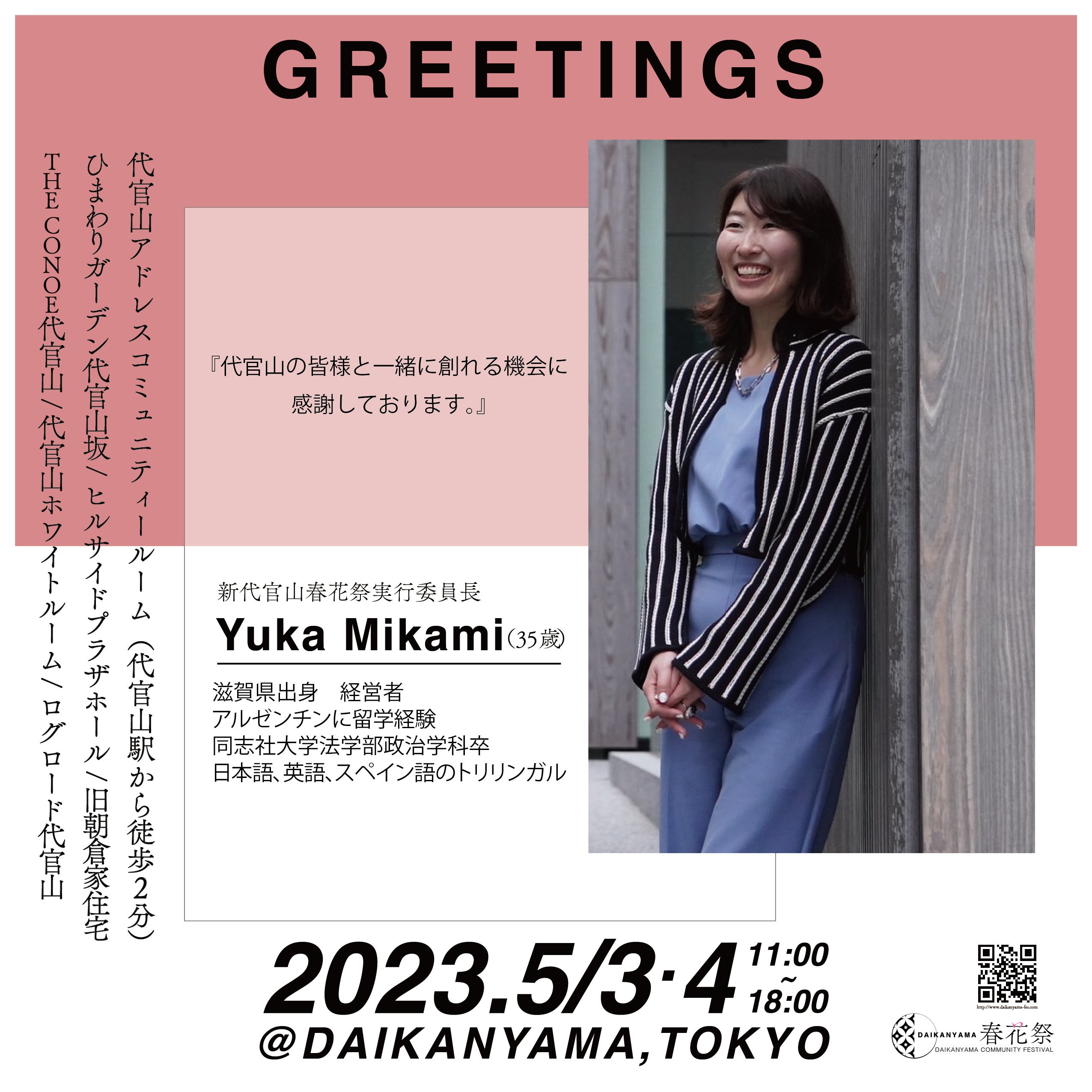 「代官山の皆様と一緒に春花祭を創れる機会に感謝しております。世界で最もクールな街にランクインした『代官山』。住む人々のあたたかさ、幅広い層に愛される店、洗練されたアートや音楽に建築物。緑豊かで心地よい空間に包まれてみませんか?」