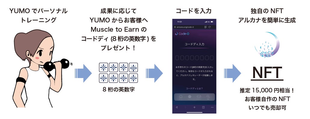 当社のお客様は、運動習慣や生活習慣の見直しを通じて、自分の体型を頑張って変えることで自信をつけるという感動的な体験をしています。この体験には、唯一無二の価値があります。 日本においては医療費の削減が課題となっていますが、一人一人の小さな試みが増えることで経済の循環が生まれ、社会全体が豊かになると考えています。 そこで今回、当社の目指している優しい体づくりや成果の結果を「NFT」※2と呼ばれるブロックチェーン上のデータにして、セカンダリーマーケットで売却してお金にできる「Muscle to Earn」を実施いたました。