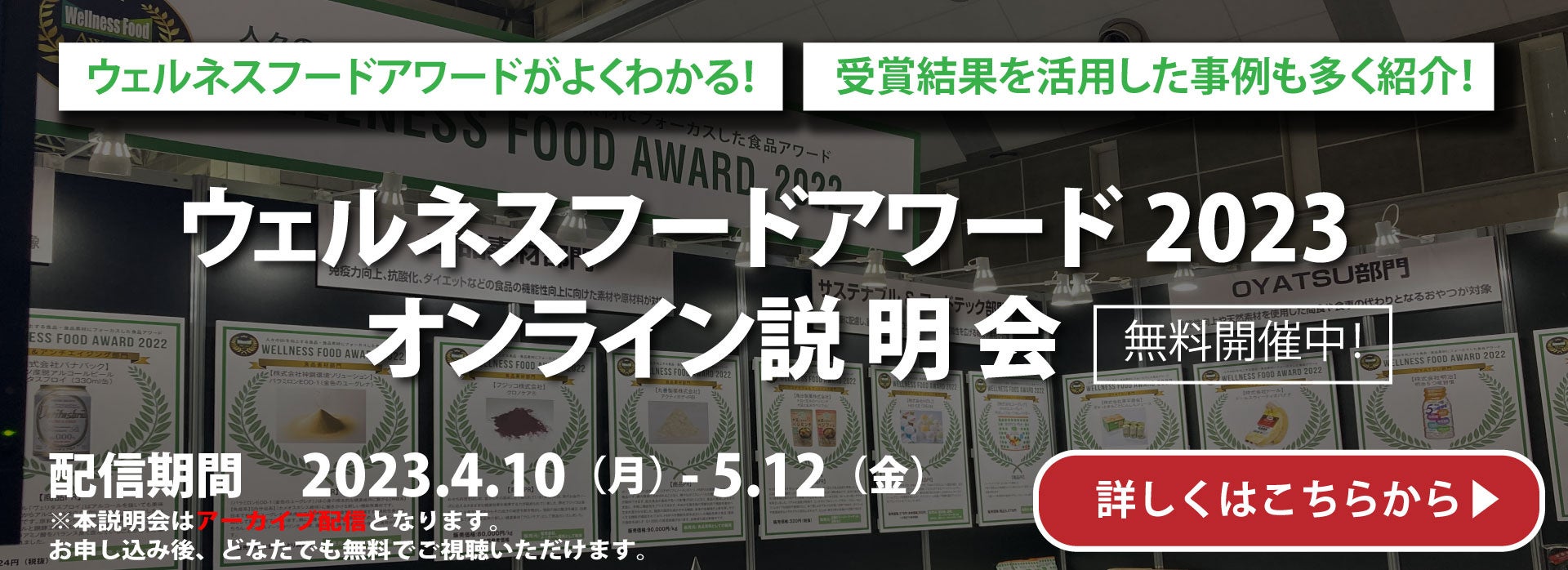 と4つのヘルスクレームに変更しております。また、最終審査は展示会ウェルネスフードジャパン2023内にて、応募者による3分間プレゼンテーションを審査員の前で行い、全プレゼンテーション終了後、各部門の「金」「銀」「銅」および「最優秀賞」を決定し、昨年より規模を大きく拡大して開催いたします。