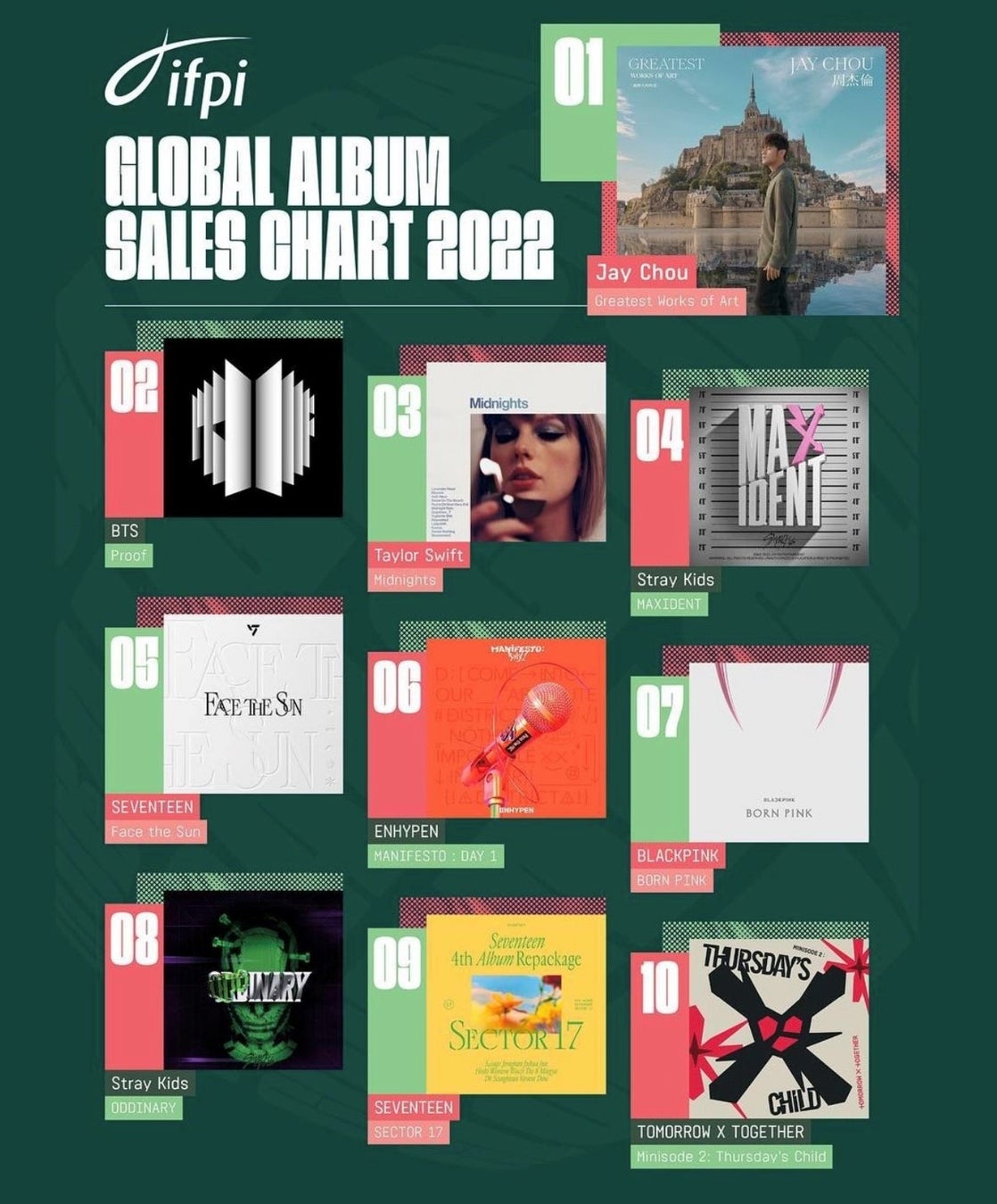 「2022グローバルアルバムセールスランキングトップ10」は2022年のフィジカルアルバム(CDとLPを含む)とデジタルアルバムのグローバルセールスの合算に基づいたランキングとなっており、ジェイ・チョウは昨年7月にリリースしたアルバム「Greatest Works of Arts」がダントツでの第1位の売り上げとなった!