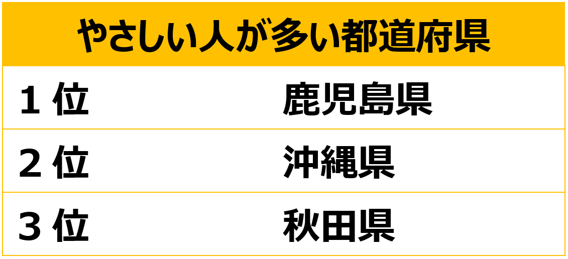 やさしい人が多い都道府県1位は「鹿児島県」2位「沖縄県」3位「秋田県」