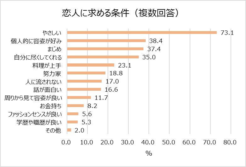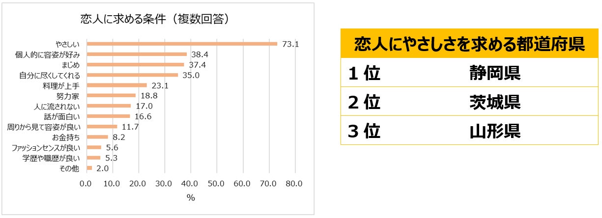 「やさしさ」は世の中でどれくらい重要視されているのかに迫るべく、一つの基準として「恋人に求める条件」も聞きました。その結果、「やさしい(73.1%)」が圧倒的1位に。「やさしい」と回答した人の割合が最も多かったのは「静岡県」、続いて「茨城県」「山形県」という結果でした。