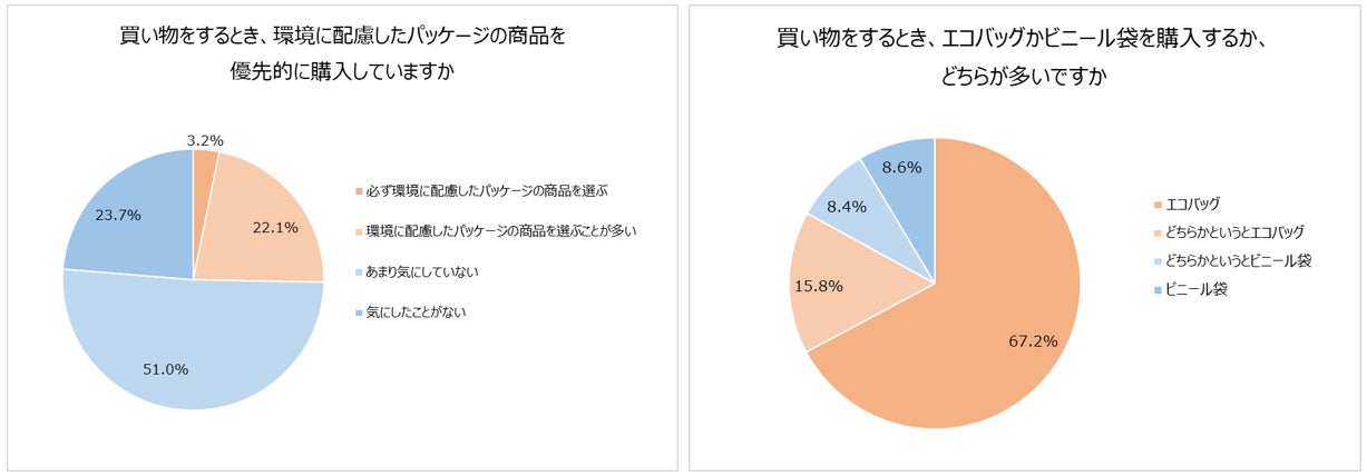 「環境へのやさしさ」についても調査を実施。買い物をするとき環境に配慮したパッケージの商品を必ず選ぶ人・選ぶことが多い人は25.3%と少数派。一方で、ビニール袋を購入するのではなくエコバッグを使用している人は8割以上でした。エコバッグの使用など、エコへの意識を持っている人は多いものの、パッケージなど細かいところまで気にしている人はまだ少ないことが分かりました。環境に配慮したパッケージにはどんなものがあるか知らない、という人も一定数いるかもしれません。