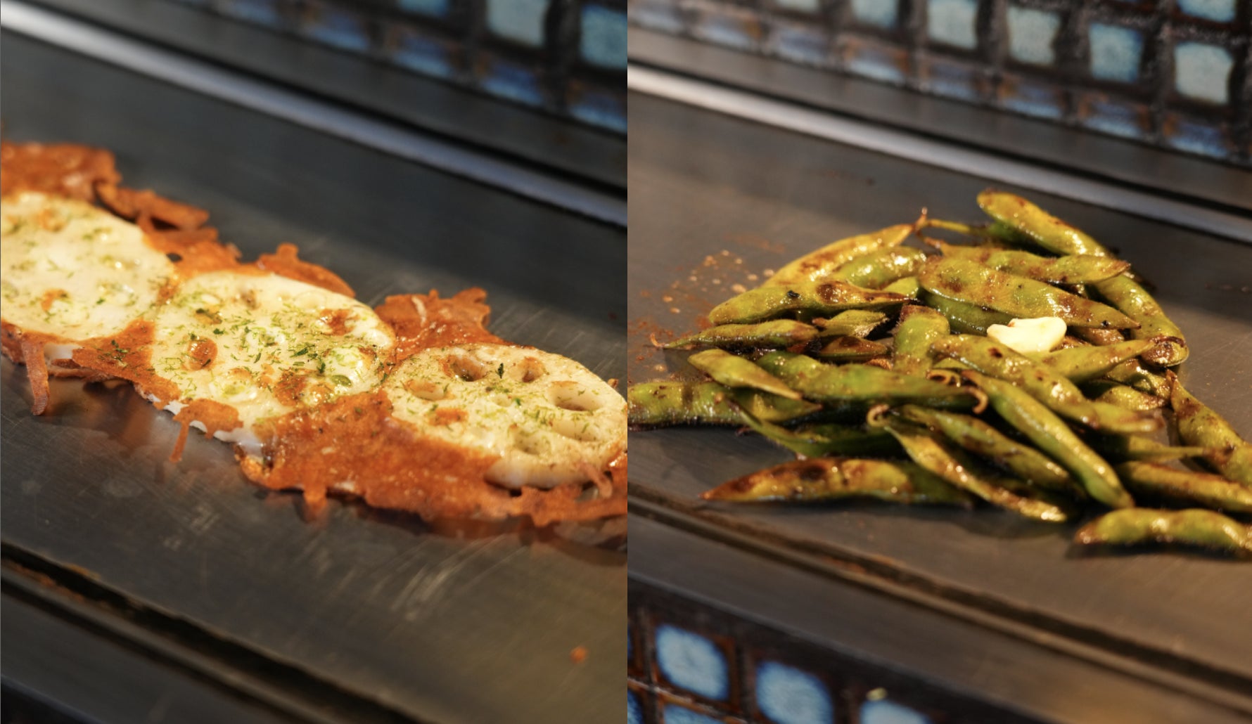・「蓮根チーズチップス」¥490(税込) | 「焼き枝豆〜焦がしバター醤油」390円(税込)