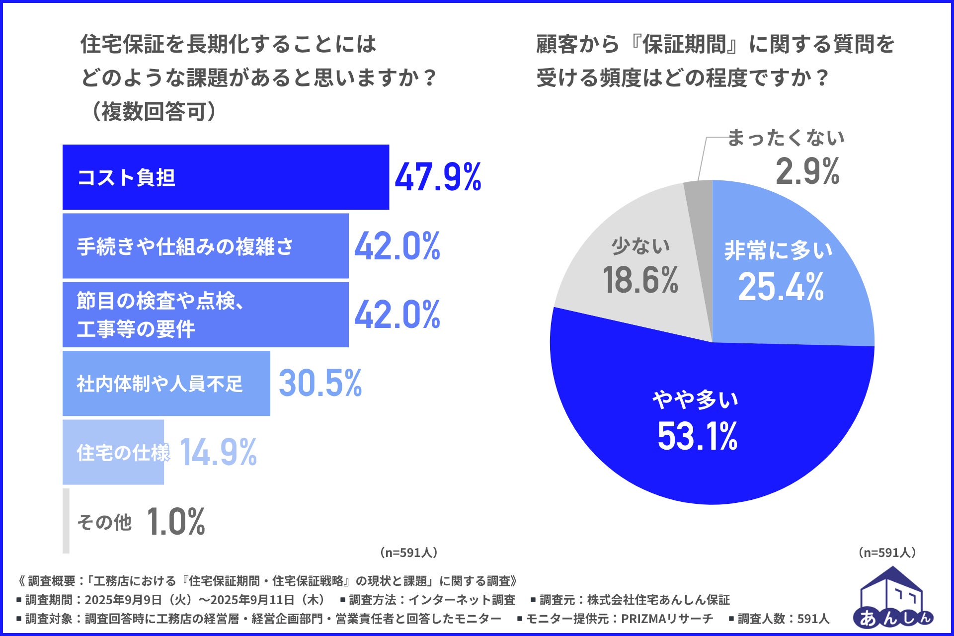 とりわけ⼯務店においては、「現在の住宅保証期間がどの⽔準にあるのか」「住宅保証を経営戦略としてどのように位置づけているのか」「住宅保証強化に向けた課題がどこにあるのか」といった点が注⽬されます。