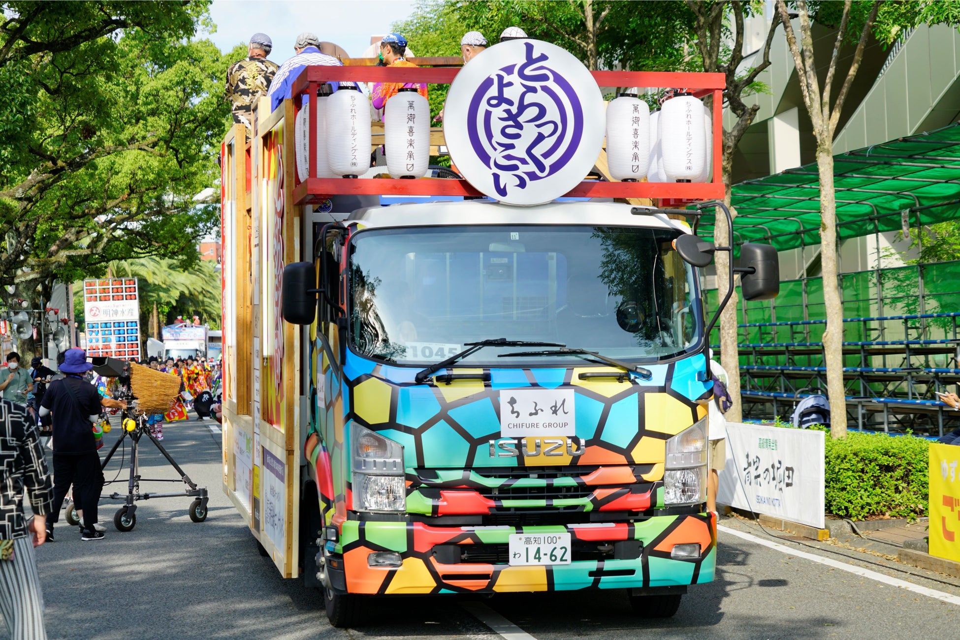 よさこい祭りに欠かせないのが「地方車」です。地方車とは、音響機材を載せて、装飾を施したトラックのことです。チームの先頭で踊り子を先導するので、チームの象徴とも言われます。