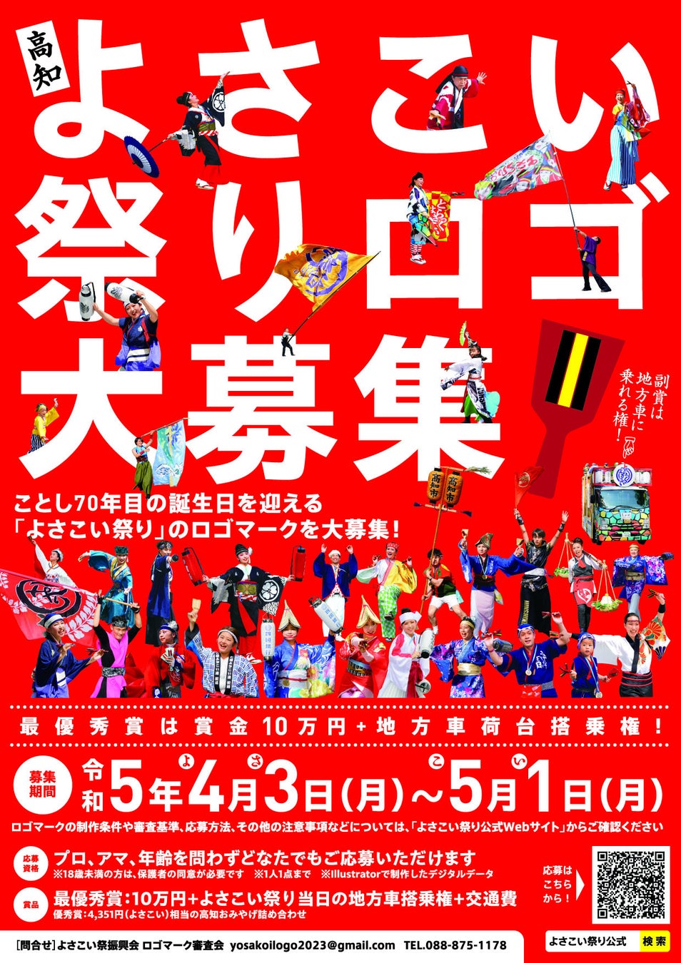 歴史ある高知のよさこい祭りで公式に使用するロゴマークを一般公募します。副賞では、なんと地方車に乗れる権利も!