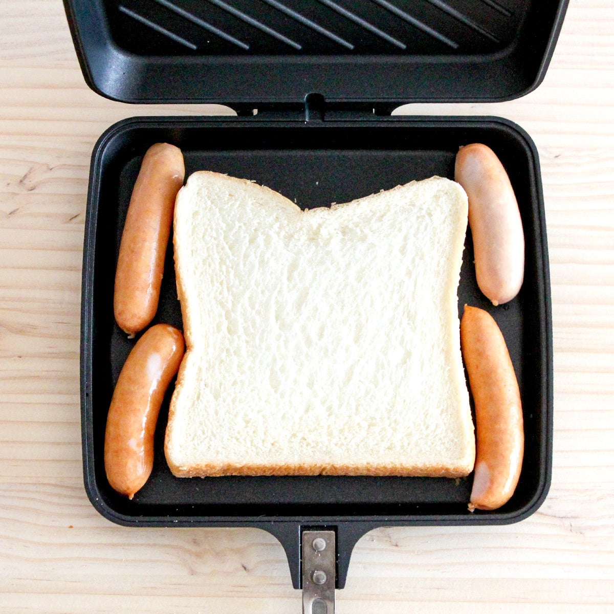 食パンの両サイドでソーセージを一緒に焼くことができます。ソーセージの旨味がパンに染み込んでさらに美味しく♪