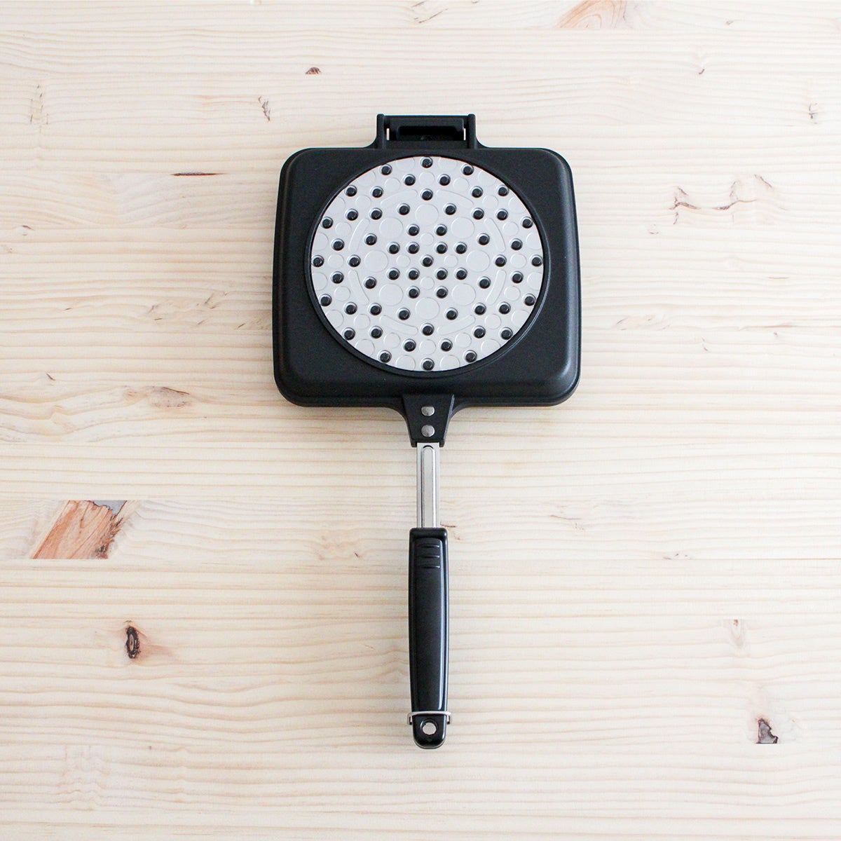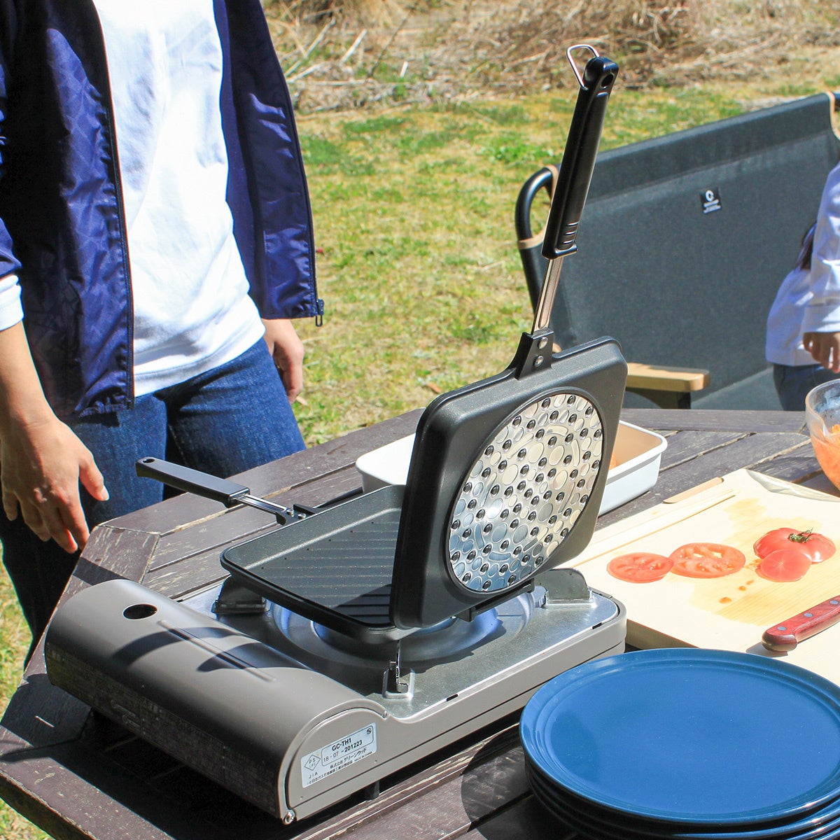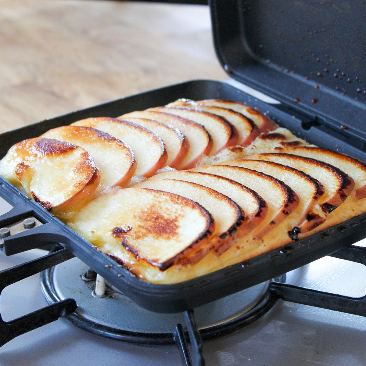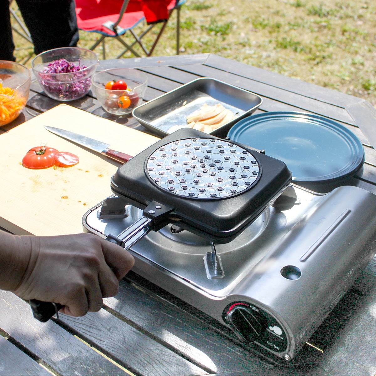一般的なホットサンドメーカーと比べて、面積と容量が増えた分、少し重くなっていますが、アルミニウム合金とステンレス底板の特殊構造「アルプレッサ」により熱伝導が良いため、大きいから焼けるのに時間がかかることはありません。上下分離タイプなので、波型と平面の2枚のフライパンとしてアウトドアにも活躍◎