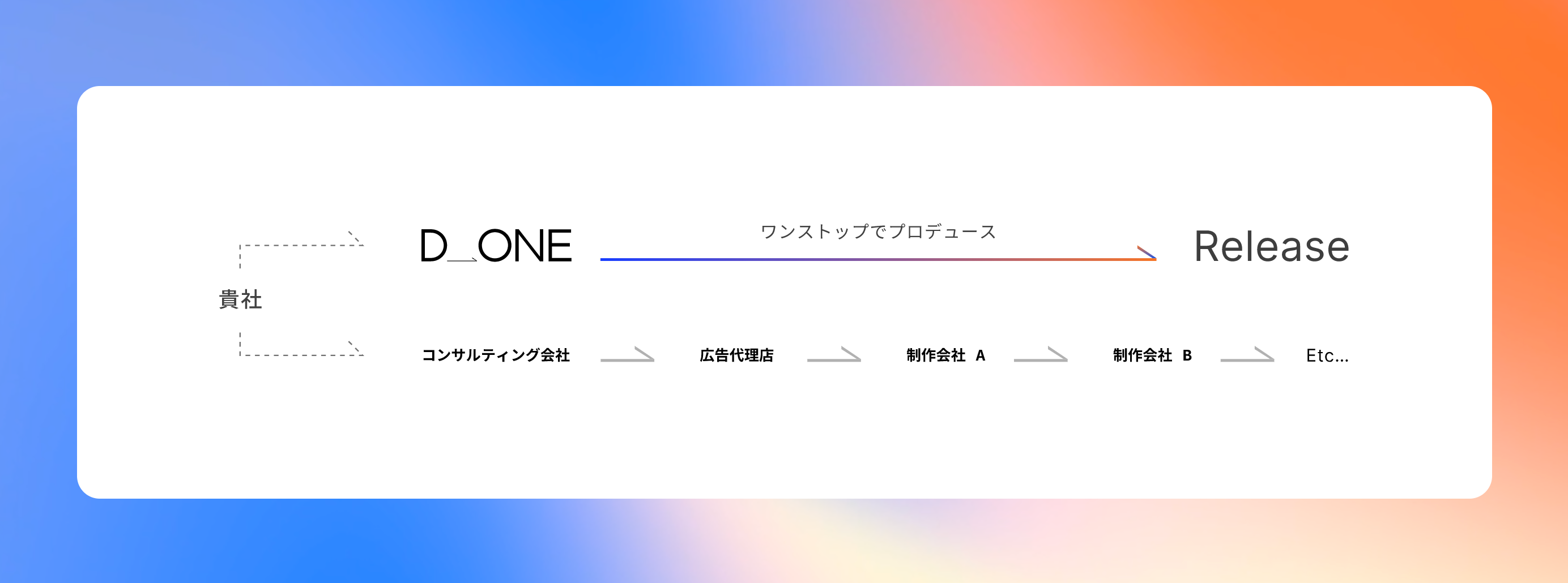 一般的にブランド立ち上げにはプレイヤーがたくさん登場します。バラバラと依頼したクリエイティブを社内で管理するだけでも大変です。D_ONEはブランドの立ち上げに必要な、さまざまなデザイン、クリエイティブを一括で制作します。またネーム開発やブランドのアイデンティティ構築なども対応。ゼロからワンストップでブランドローンチまでサポートします。