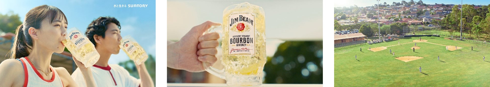 新しいジムビームのTV-CMでは、青空の下でジムビームハイボールを飲みながら、草野球チームを応援する賀来さんと井桁さんの様子が描かれています。お二人が心のままに、ウェーブのパフォーマンスで自由に応援するユーモラスなシーンが見どころとなっており、アクティブで爽快感溢れるTV-CMに仕上がりました。
