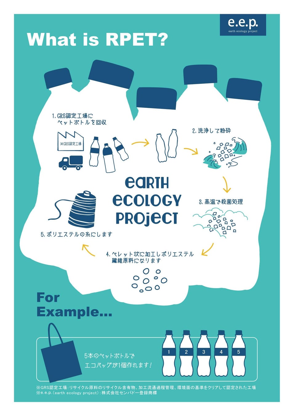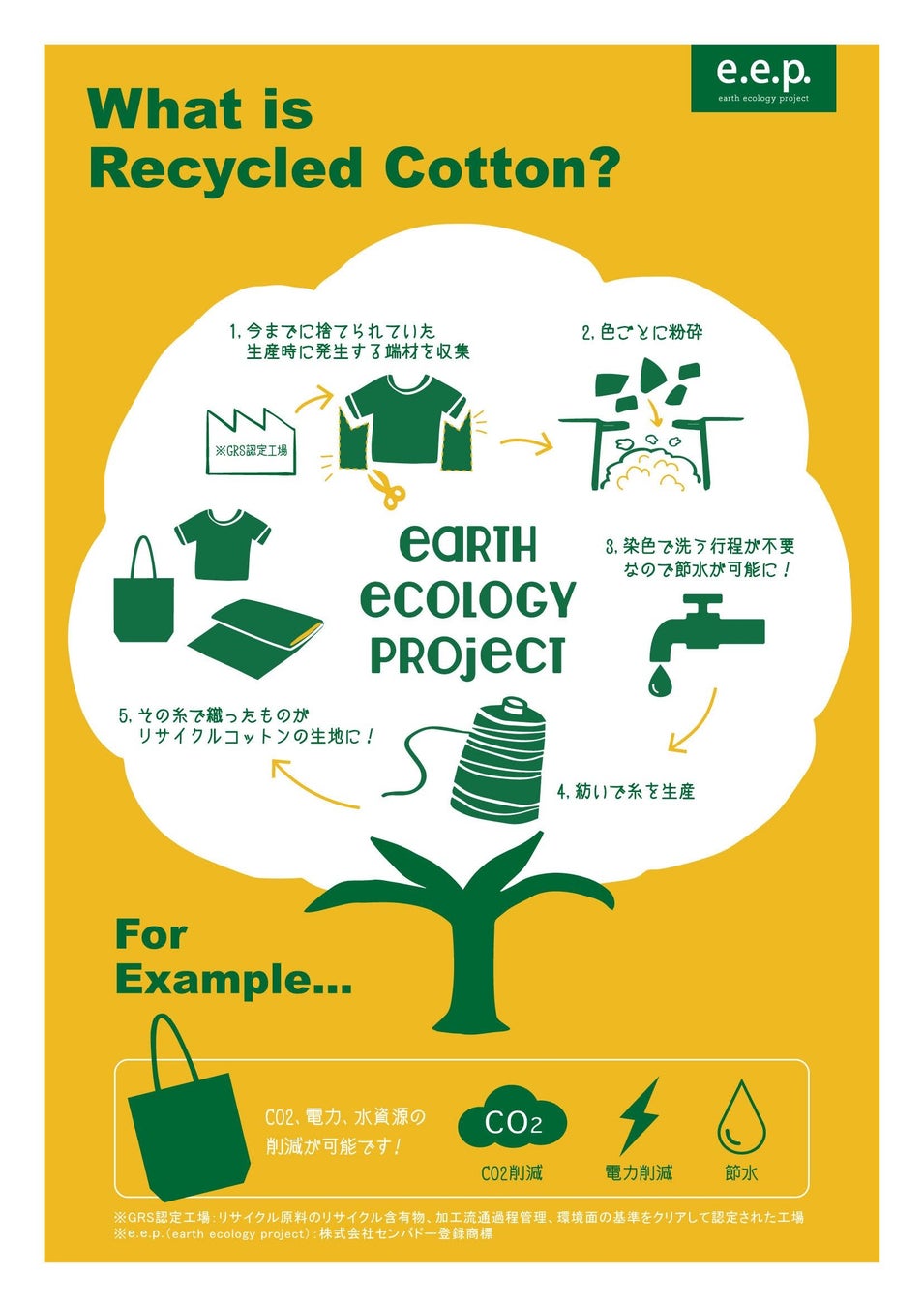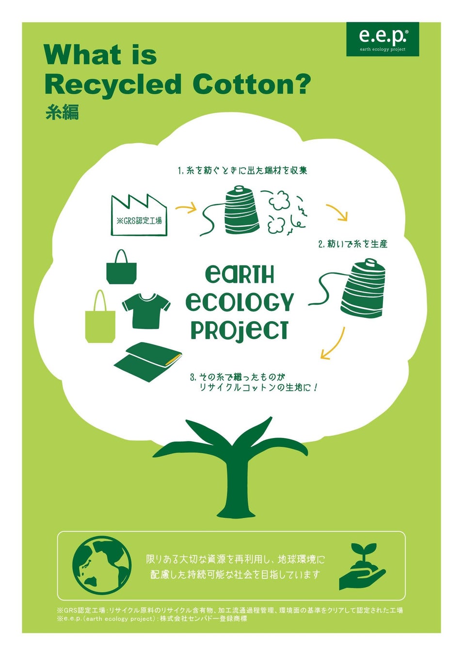 環境負荷を抑えて、より豊かな生活を彩る地球と人に優しい雑貨ブランドを目指しています。GRS認定素材はポリエステル系生地とコットン系生地の2種類があります。ポリエステル系生地は、GRS認定工場でペットボトルを回収し、洗浄→粉砕→高温で殺菌処理を行ってから、ペレット状に加工したポリエステル繊維原料にして糸を紡ぎます。その糸から作った生地はGRS認定のポリエステル再生生地になります。また、コットン系のリサイクル生地は、今まで破棄されていたガーメント系商品の生産時に発生する端材を収集し、色ごとに粉砕して糸を紡いで生地を織ります。染色で洗う工程が不要なので、節水や節電も可能になります。その他、綿糸を紡ぐ工程で発生する本来は廃棄される落ち綿を収集し、その綿で紡いだ糸で作ったリサイクルコットン生地を利用することもありあす。ポリエステル系生地やコットン系生地も含め、あらゆる生産工程で資源の無駄が少ない仕組み作りを行っています。