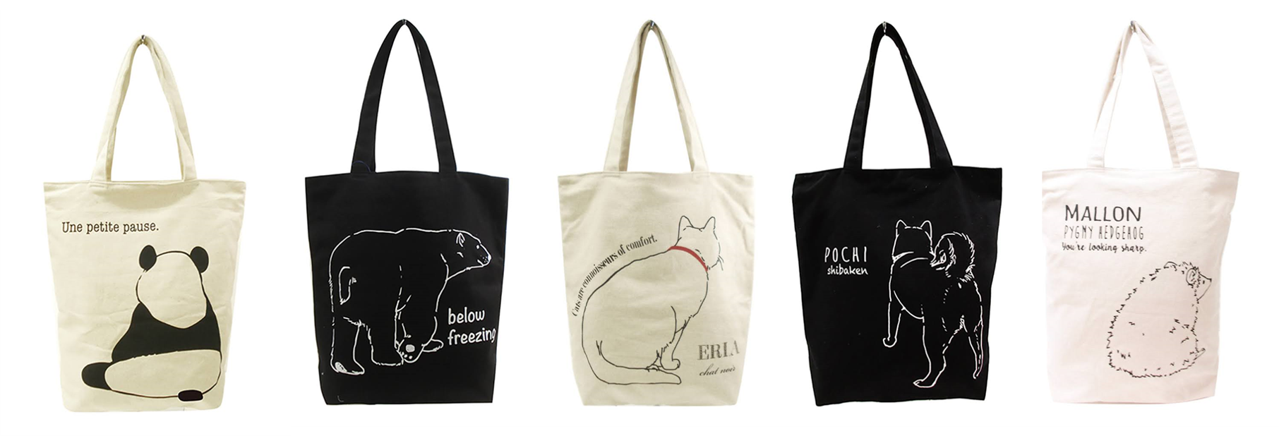 パンダやネコなど動物たちの後ろ姿をシンプルなラインで描いたA4対応サイズのトートバッグ。