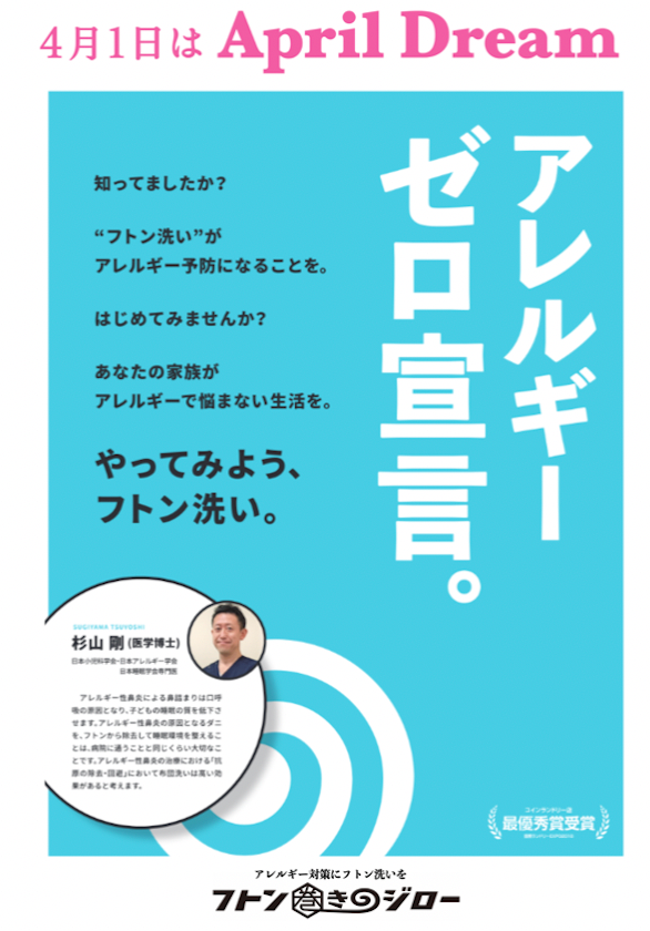 この度、新たに小児科・アレルギー専門医と連携し、“布団洗い=アレルギー治療”という認識のもと、より多くの方々にこの事実をお伝えし、アレルギーに悩む人をなくす「アレルギーゼロ宣言」を発表いたします。