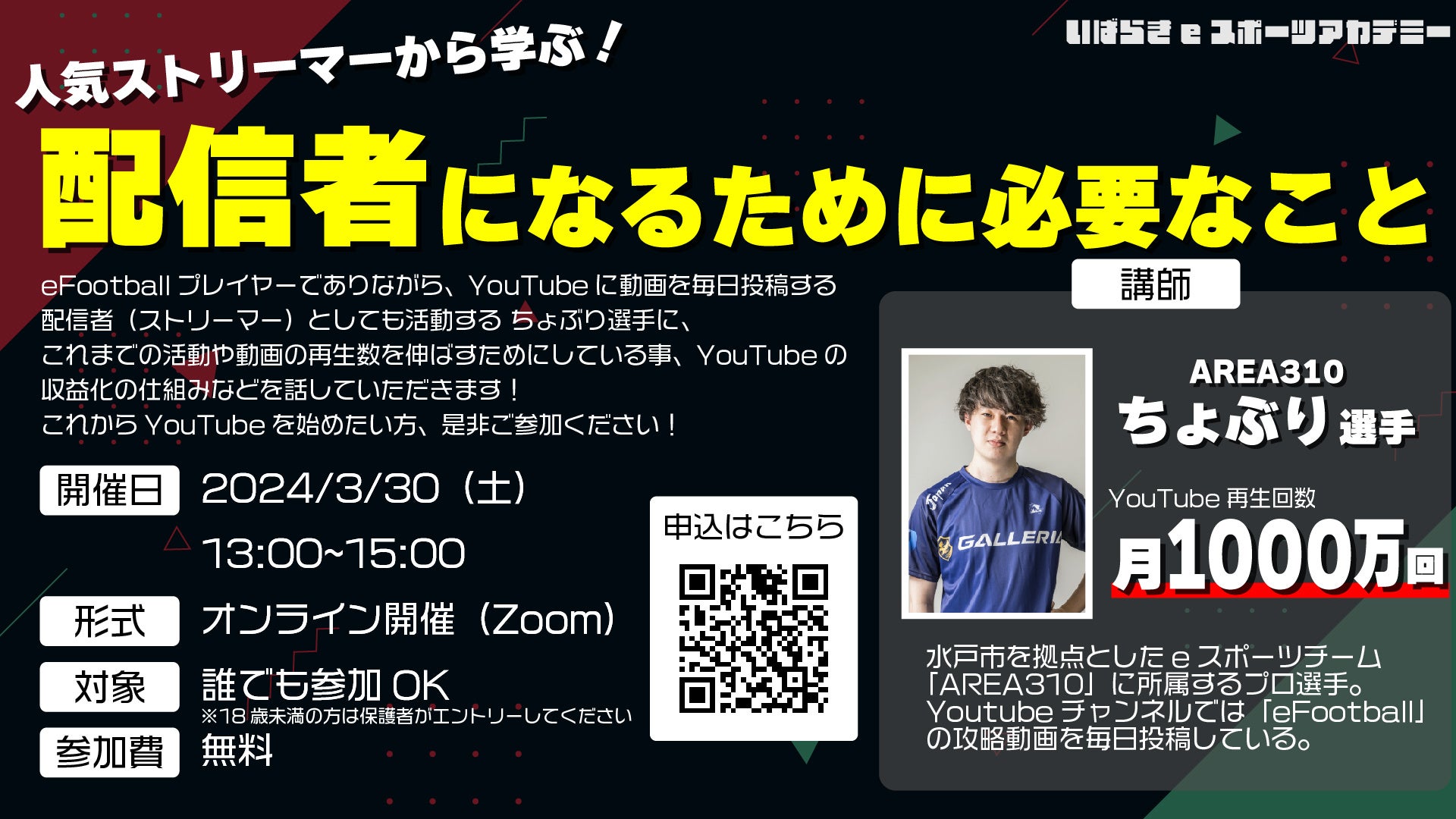 今回は、水戸市を拠点としたeスポーツチーム「AREA310」に所属するプロ選手でありながら、YouTubeに動画を毎日投稿する配信者(ストリーマー)としても活躍するちょぶり選手によるセミナーをオンライン開催いたします。