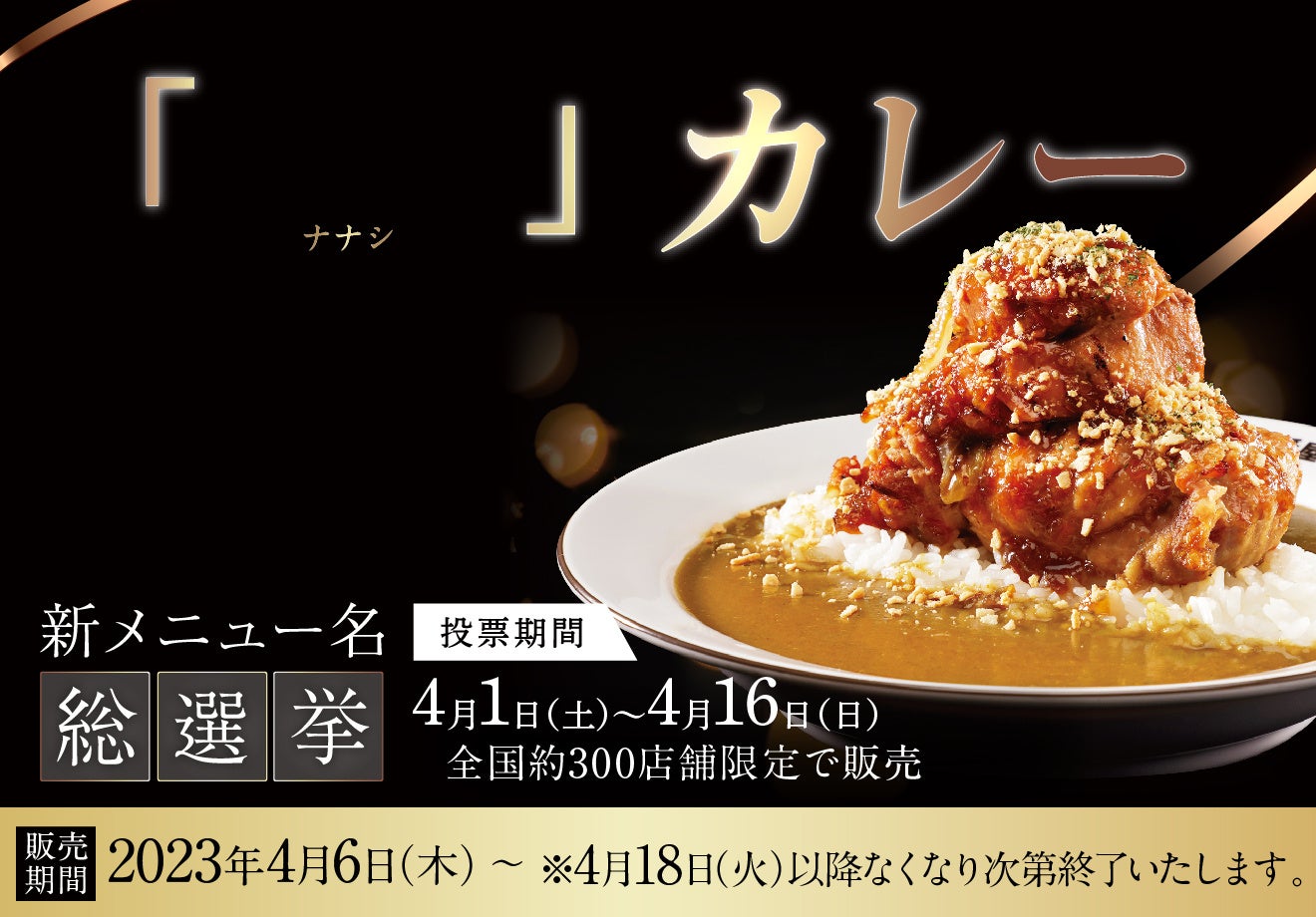 株式会社壱番屋(本社:愛知県一宮市、代表取締役社長 葛原 守)は、2023年4月1日(土)からカレーハウスCoCo壱番屋の公式ホームぺージで『新メニュー名総選挙』を開催いたします。総選挙では、4月6日(木)から全国の約300店舗で期間限定販売する新商品『「 ナナシ 」カレー』(以下、ナナシカレー)のメニュー名をココイチファンの皆様の投票によって決定いたします。
