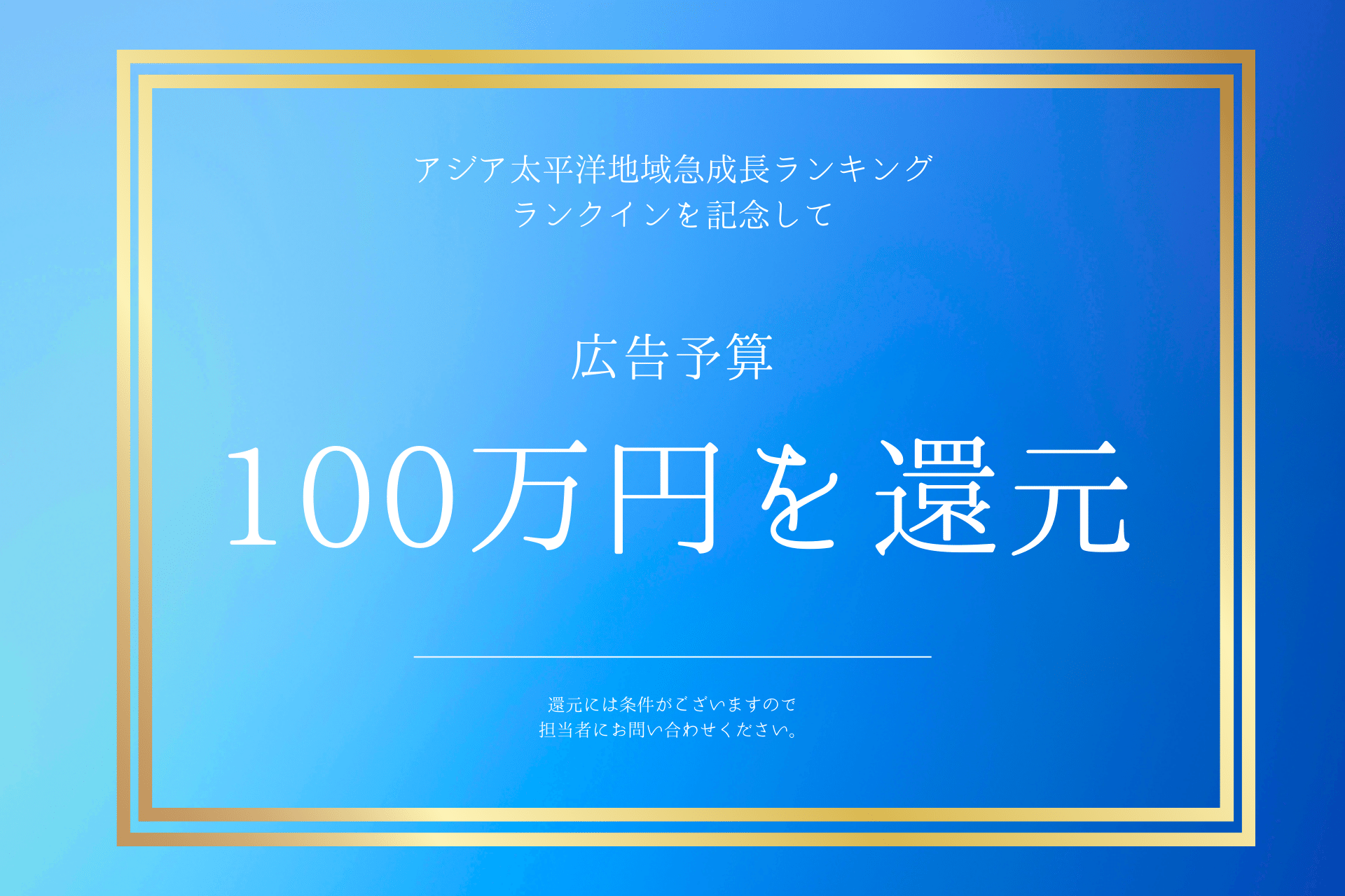 「アジア太平洋地域における急成長企業ランキング2023」でのランクインを記念し、広告予算100万円を還元するキャンペーンを実施致します。