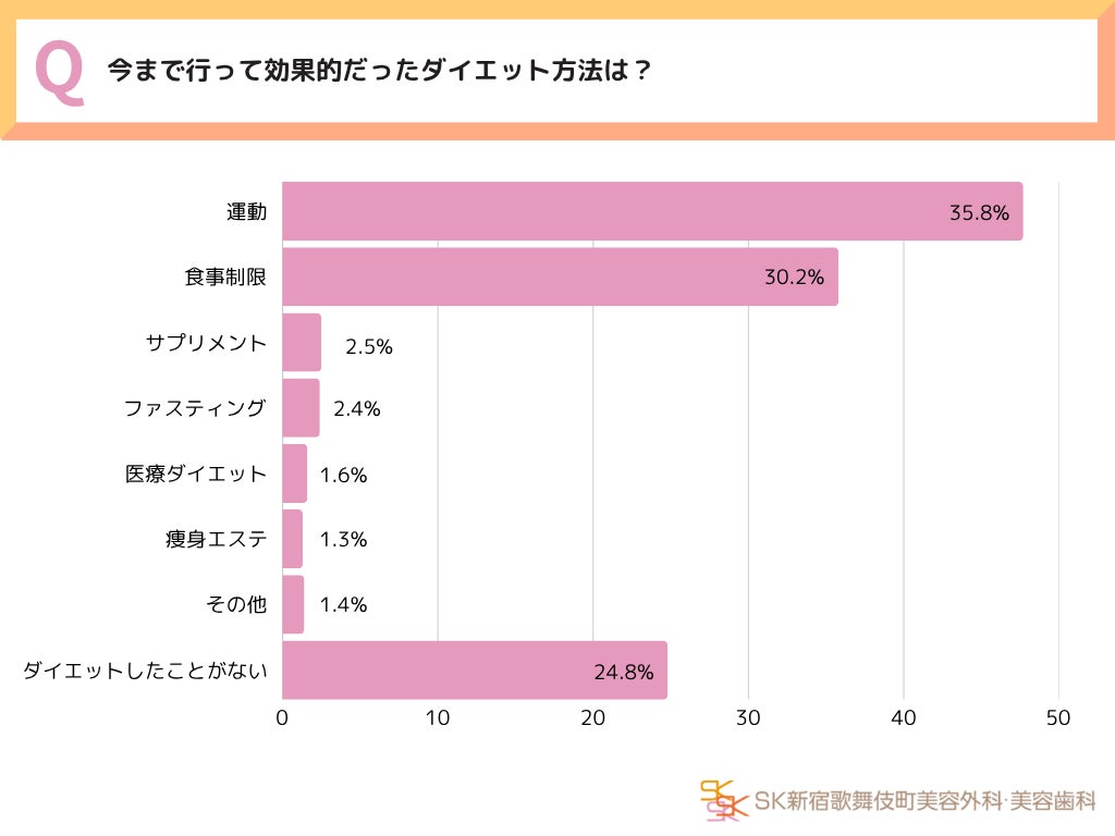 「今まで行って効果的だったダイエット方法は?」という質問では、「運動」(35.8%)と「食事制限」(30.2%)が上位を占めました。一方で「ダイエットしたことがない」と答えた人も24.8%に上り、約4人に1人は実際にダイエットをした経験がないことがわかりました。実際に“効果があった”と実感している人も、王道の方法に集中しています。ただし、情報過多の現代でも行動に移せていない人が一定数存在することは注目すべき点です。ダイエット初心者に向けた入り口づくりの重要性が見えてきます。